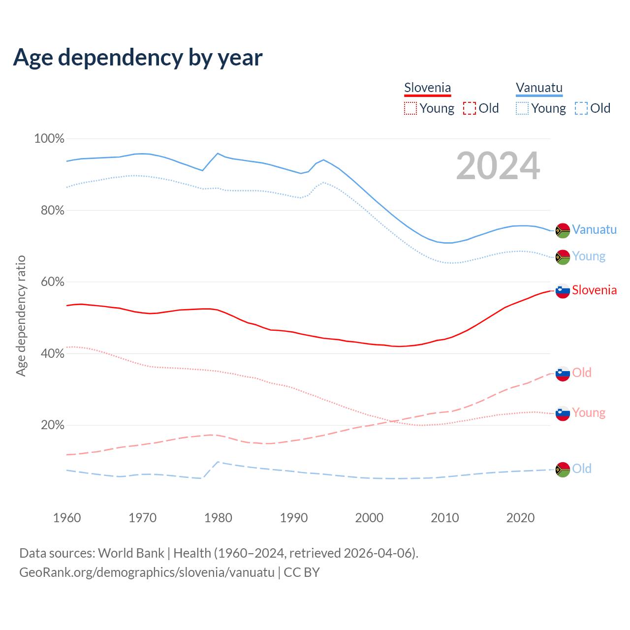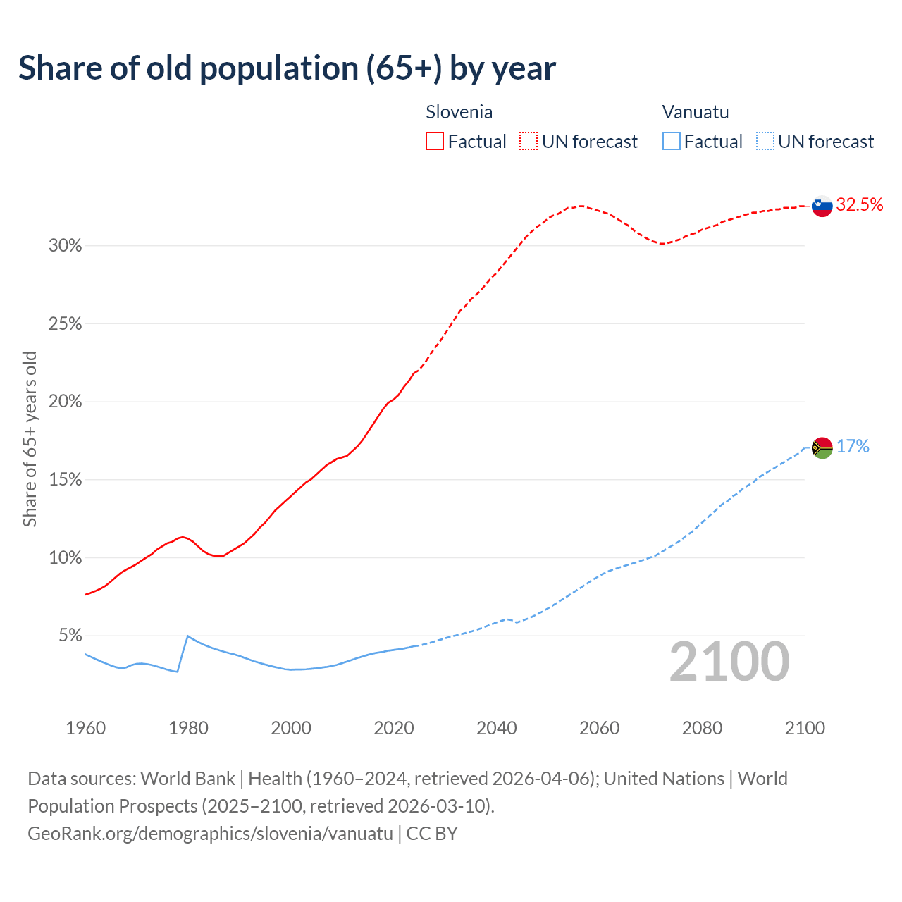 - The share of old-age demographic (65+) in Slovenia is 21.8% vs 4.3% in Vanuatu.