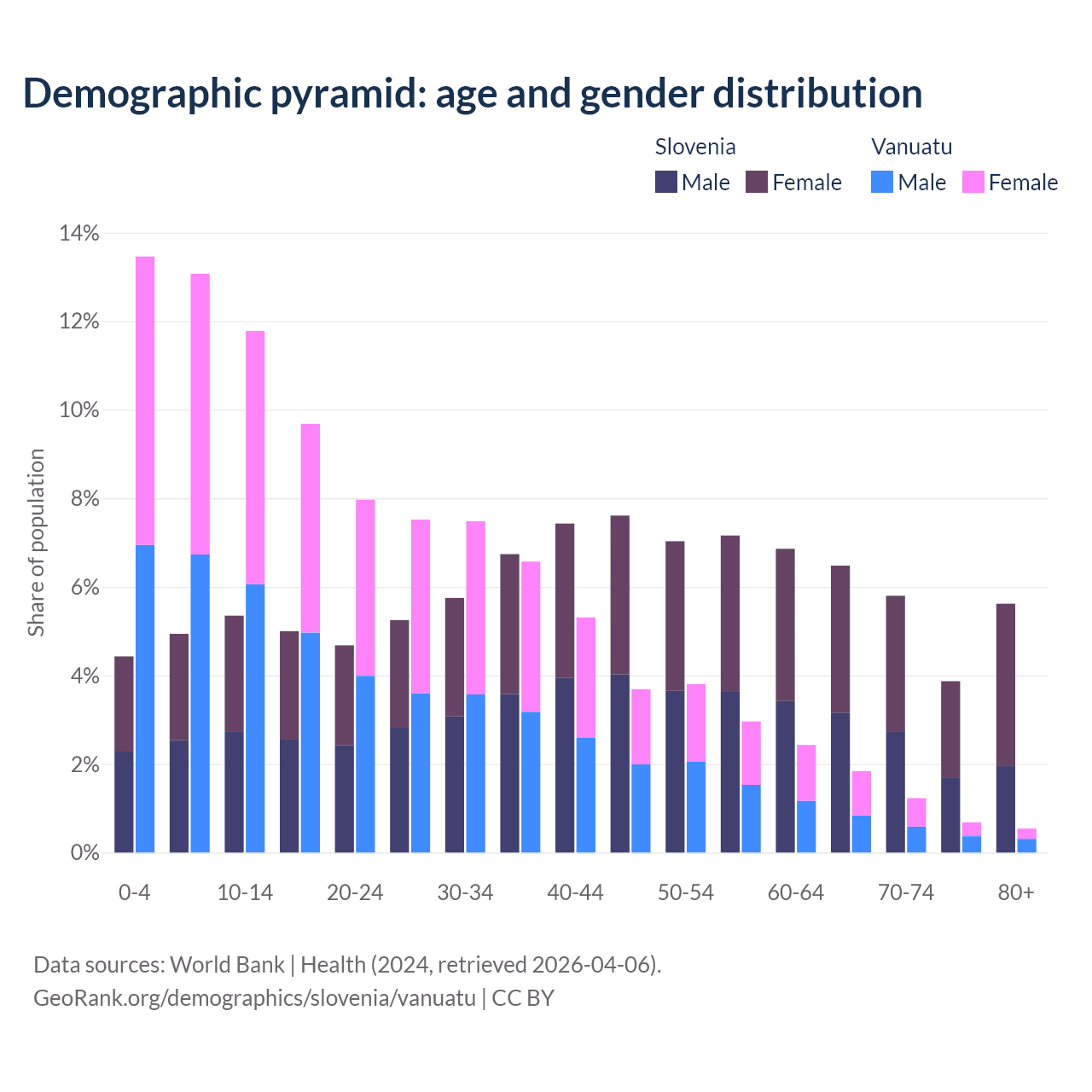 - The share of young demographic (0-15 years old) in Slovenia is 14.7% vs 38.3% in Vanuatu.