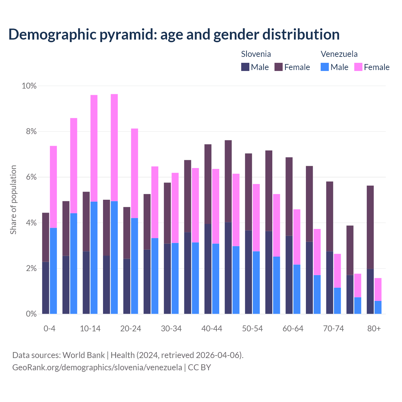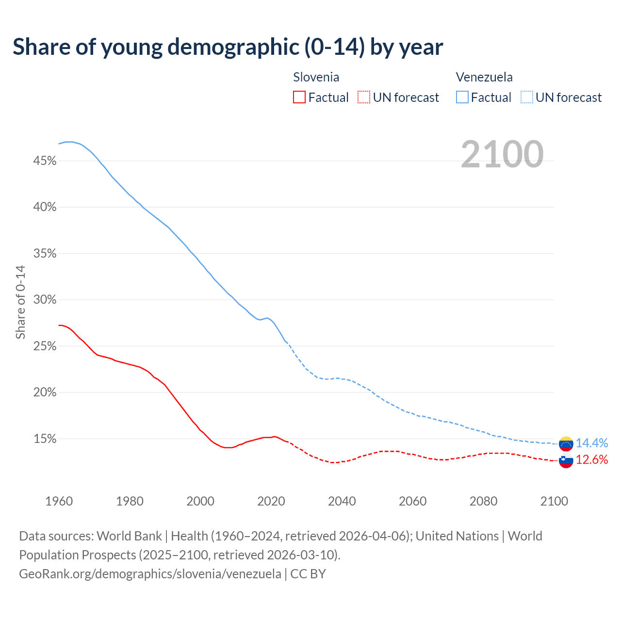 - The share of young demographic (0-15 years old) in Slovenia is 14.7% vs 25.5% in Venezuela.