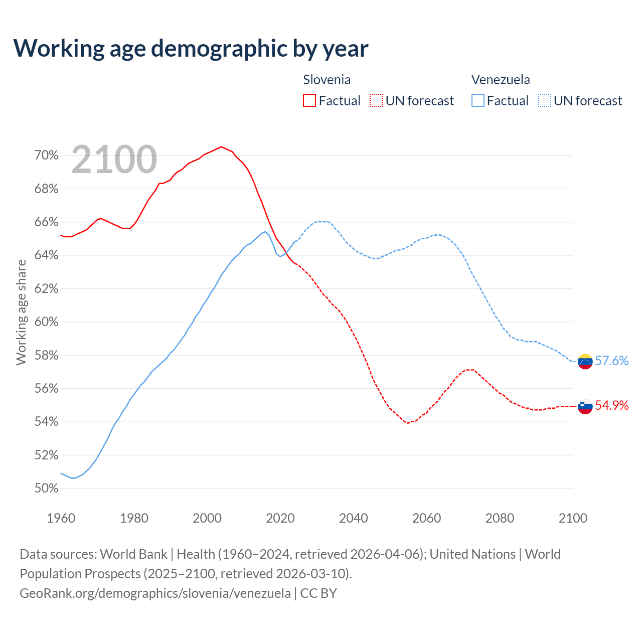 Median age Slovenia vs Venezuela, 1960-2100