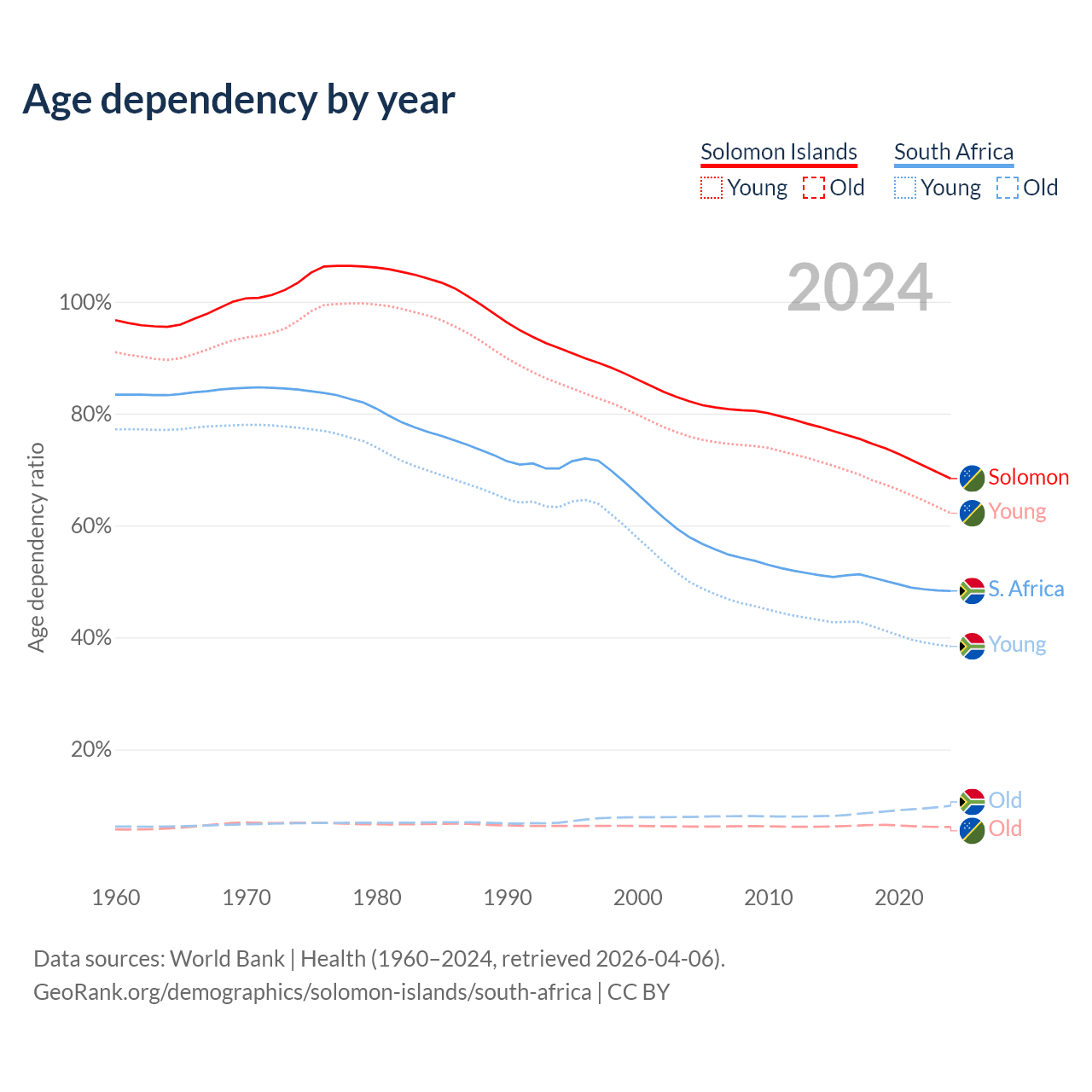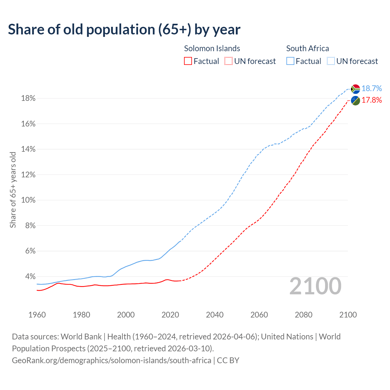 The share of older people aged 65 and over is 3.64% in the Solomon Islands and 6.69% in South Africa. Life expectancy in the Solomon Islands compared to South Africa .