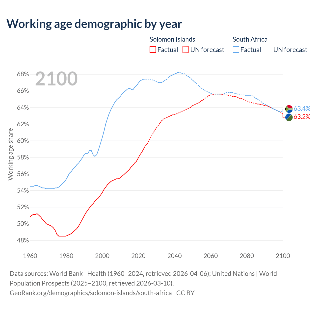 - The Solomon Islands has 513K working age adults (aged 15-64) vs 44.3M in South Africa.