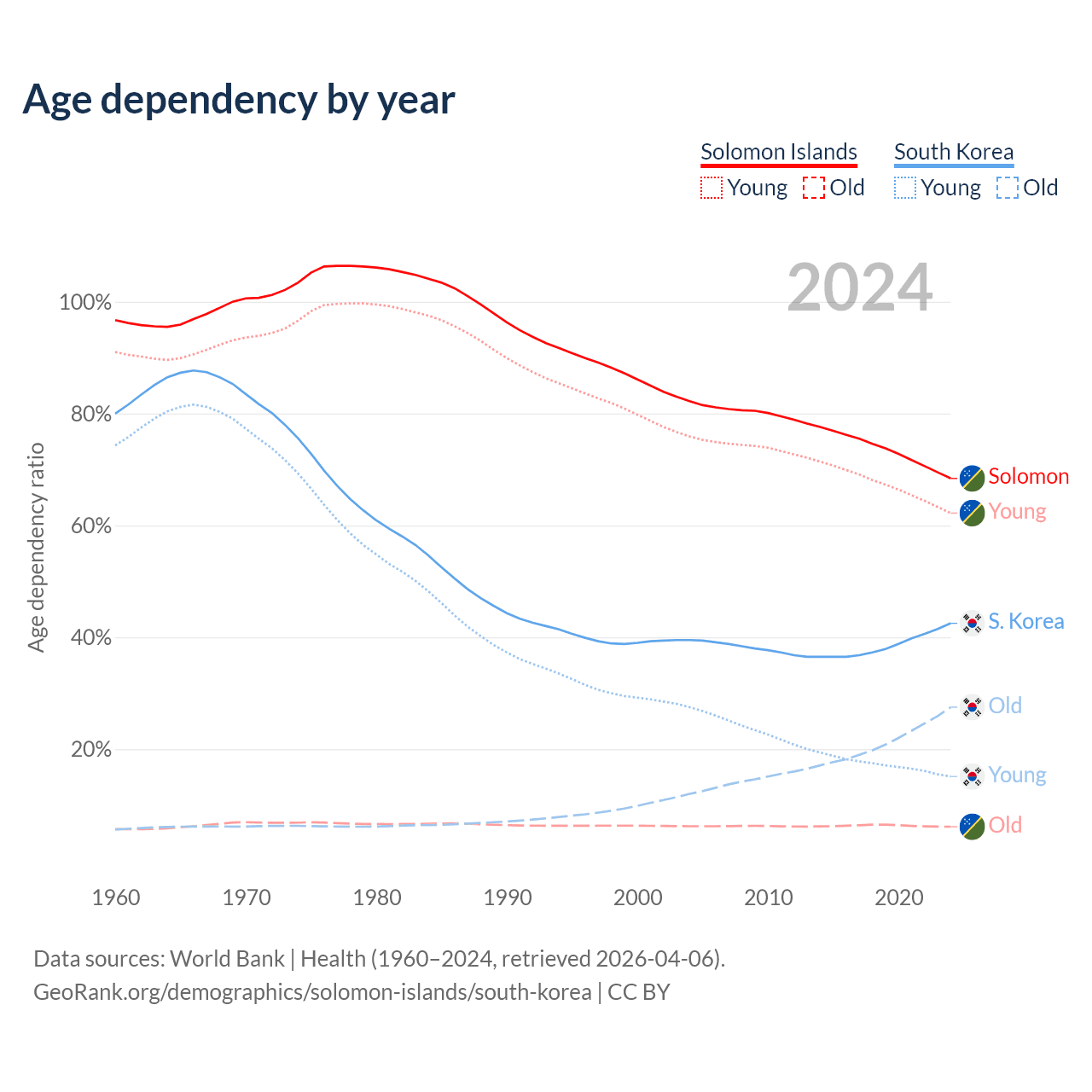 - The share of old-age demographic (65+) in the Solomon Islands is 3.64% vs 19.3% in South Korea.