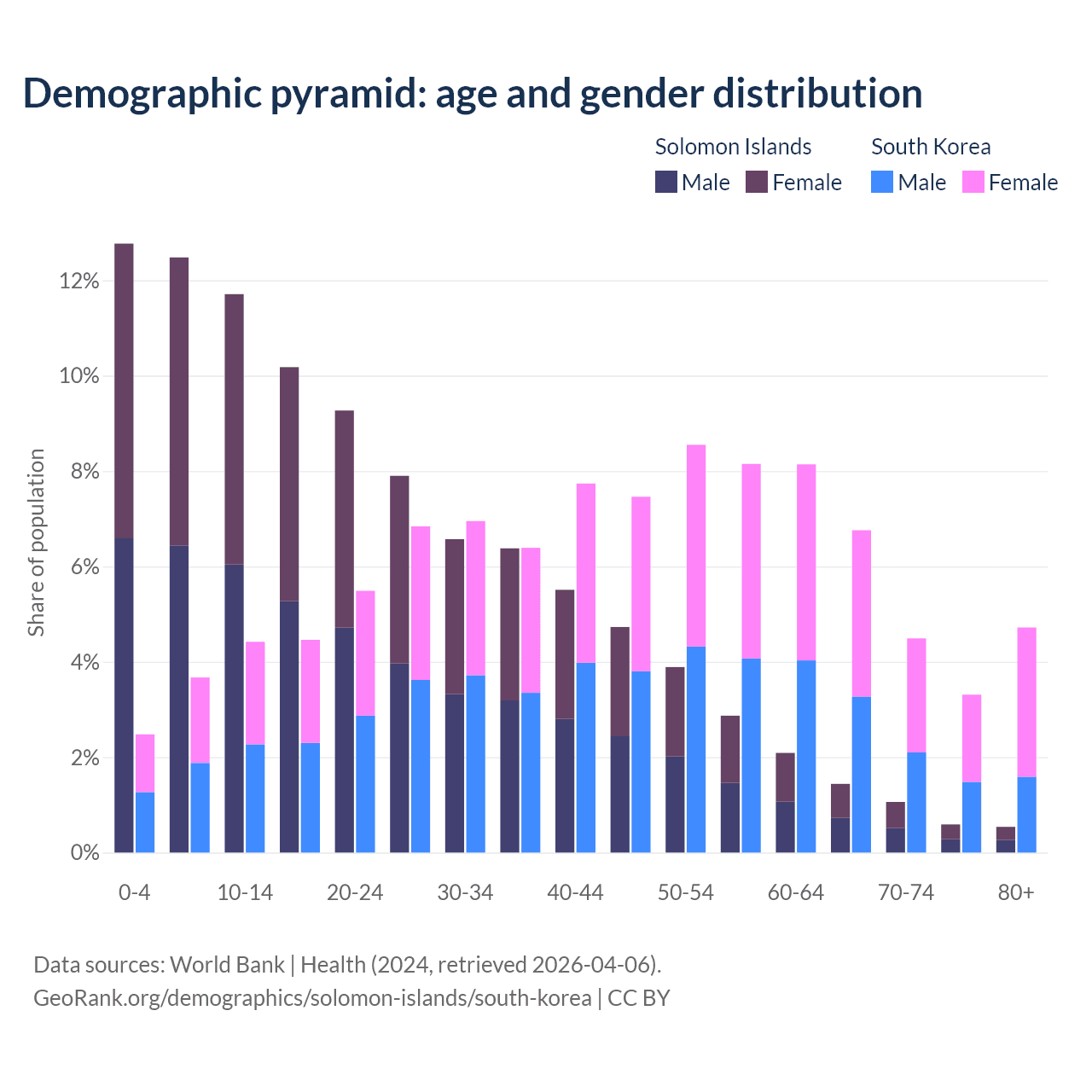 - The Solomon Islands is ranked 153/196 by median age (oldest to youngest) vs 10/196 for South Korea.
