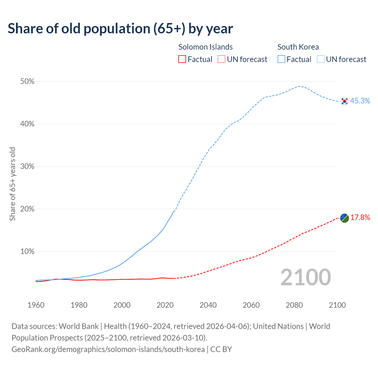 The share of older people aged 65 and over is 3.64% in the Solomon Islands and 19.3% in South Korea. Life expectancy in the Solomon Islands compared to South Korea .