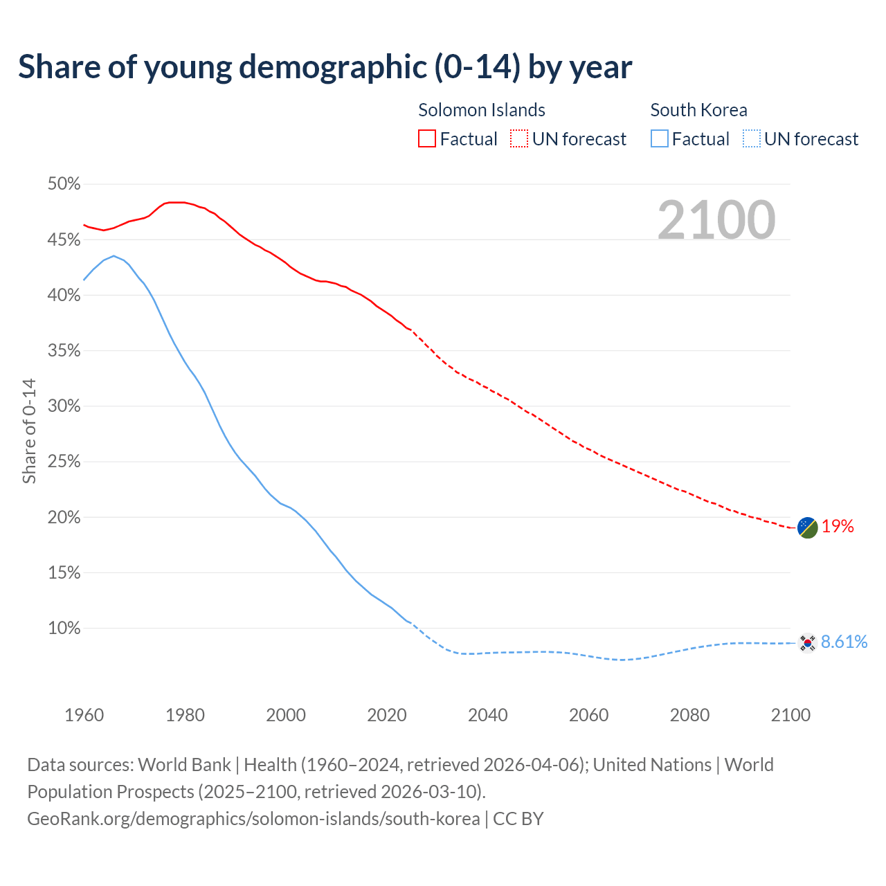 - The share of young demographic (0-15 years old) in the Solomon Islands is 37% vs 10.6% in South Korea.