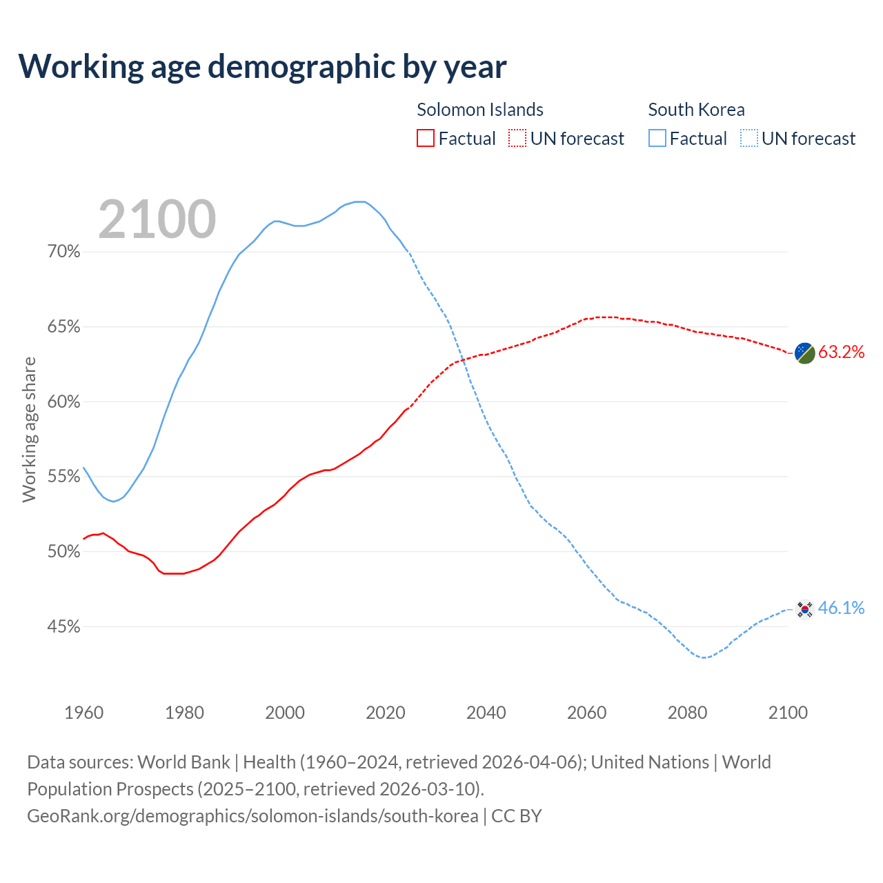- The Solomon Islands has 513K working age adults (aged 15-64) vs 36.2M in South Korea.