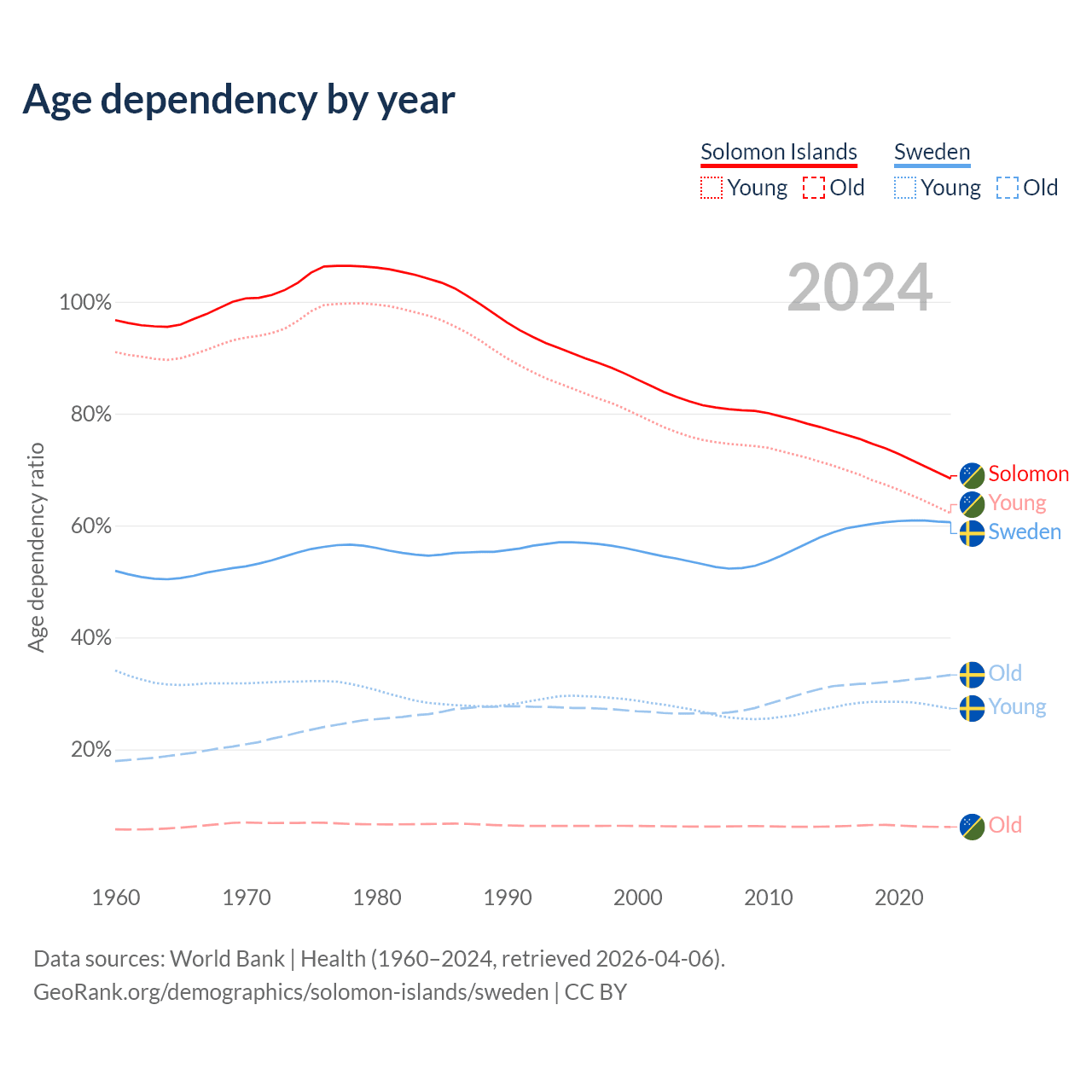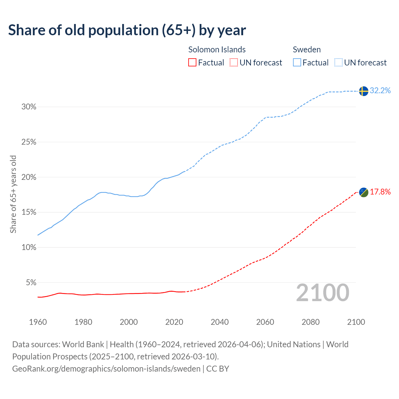 - The share of old-age demographic (65+) in the Solomon Islands is 3.64% vs 20.7% in Sweden.
