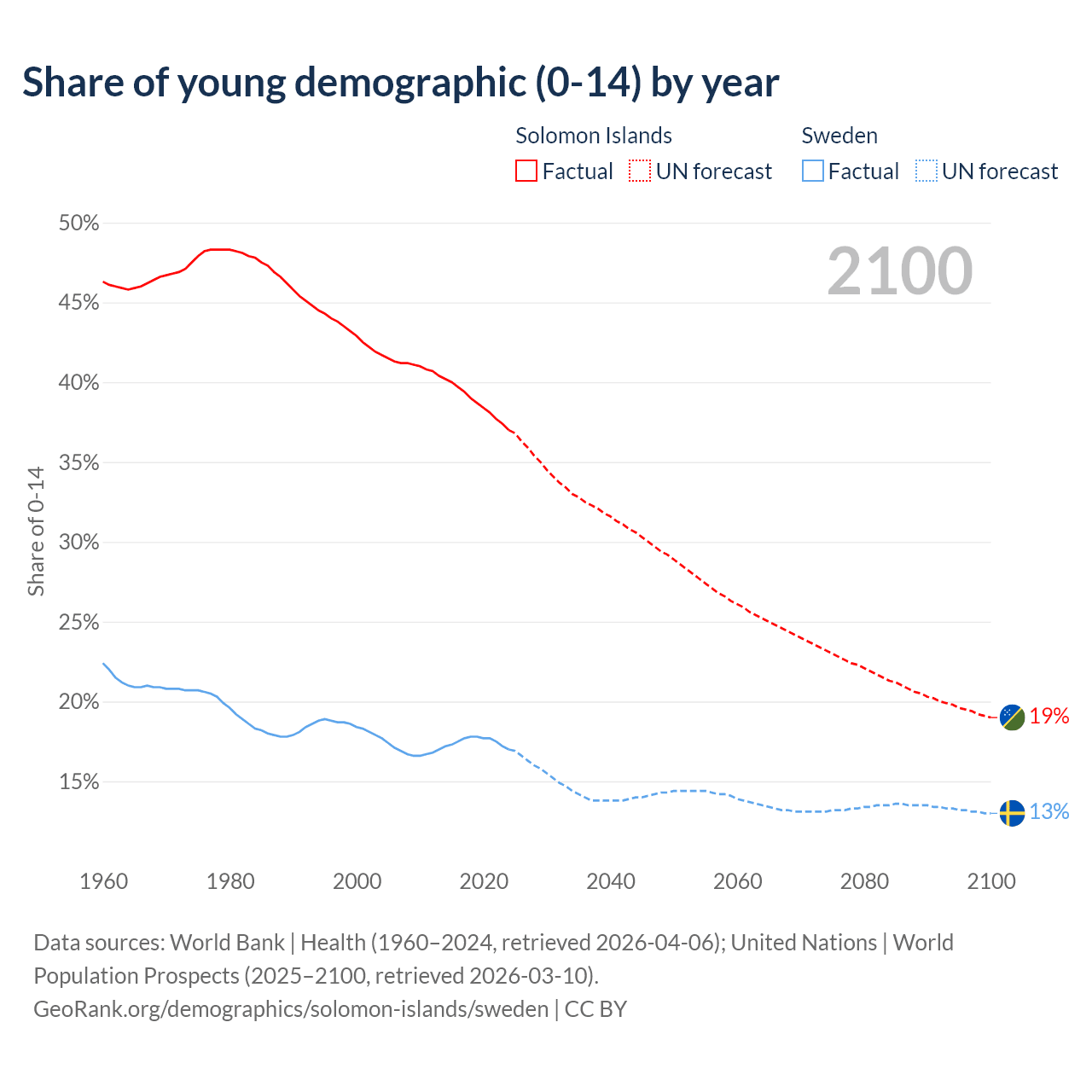 - The share of young demographic (0-15 years old) in the Solomon Islands is 37% vs 17% in Sweden.