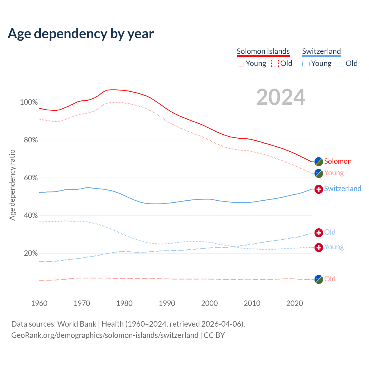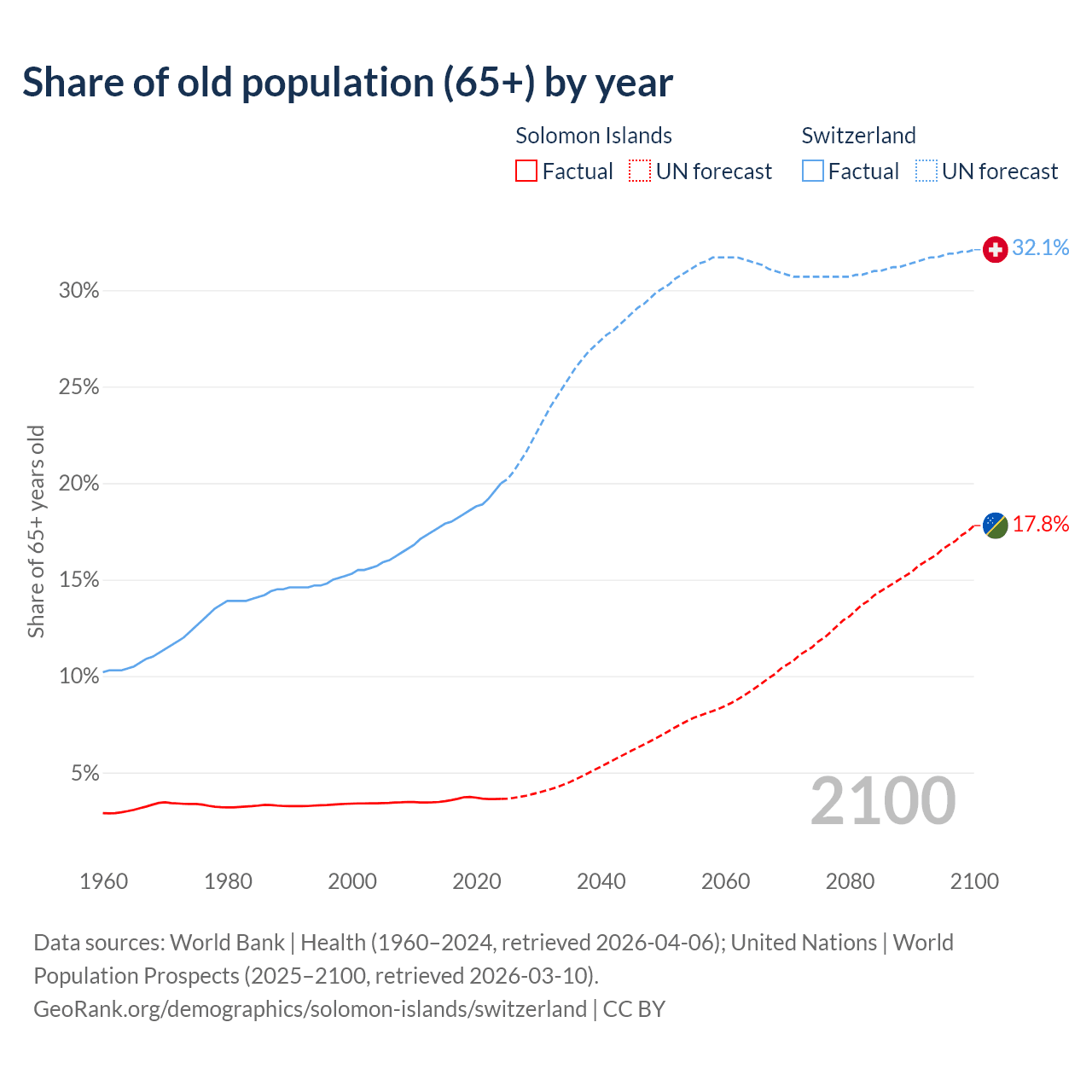 The share of older people aged 65 and over is 3.64% in the Solomon Islands and 20% in Switzerland. Life expectancy in the Solomon Islands compared to Switzerland .