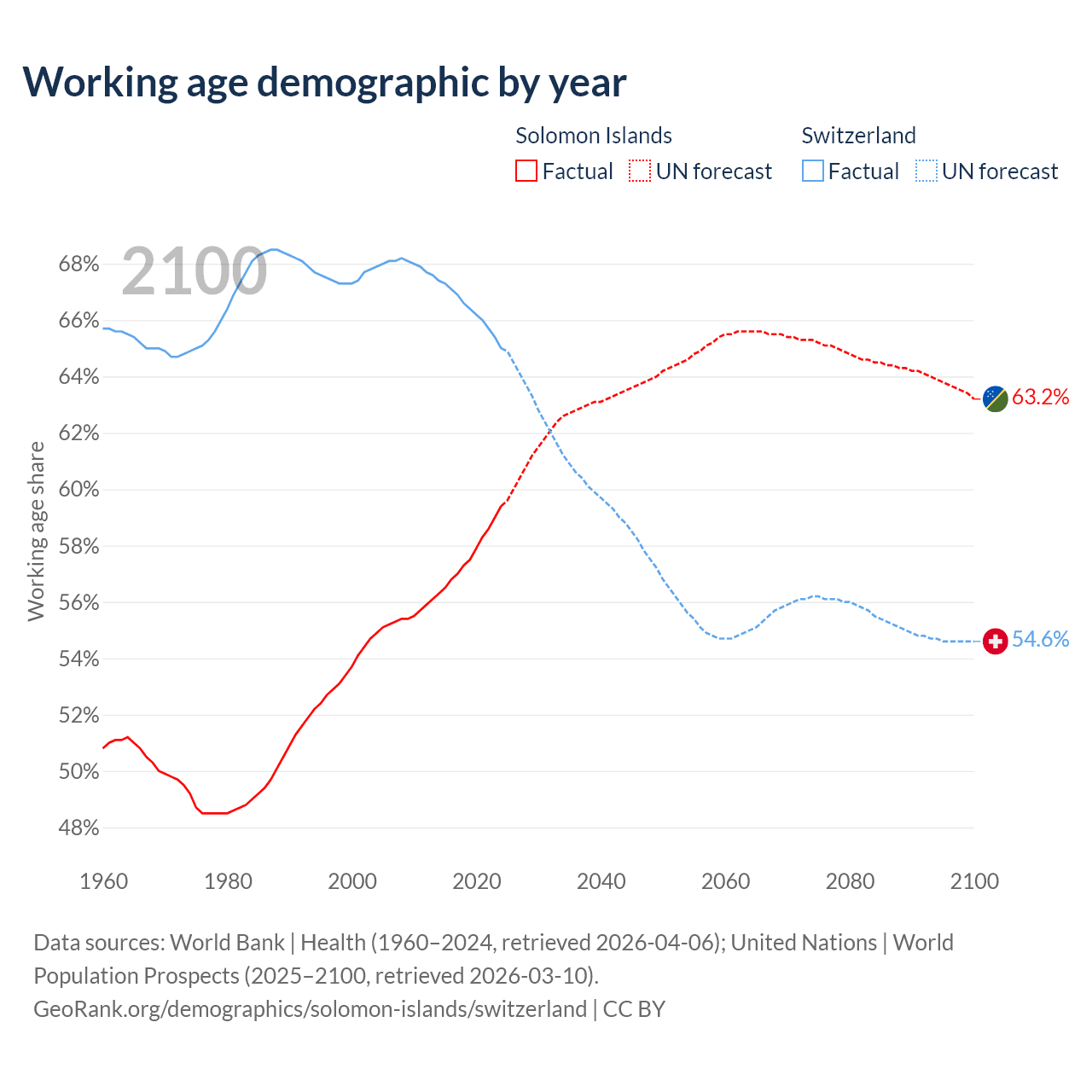 - The Solomon Islands has 513K working age adults (aged 15-64) vs 5.92M in Switzerland.