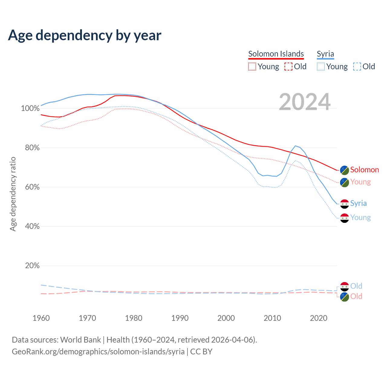 - The share of old-age demographic (65+) in the Solomon Islands is 3.64% vs 4.74% in Syria.