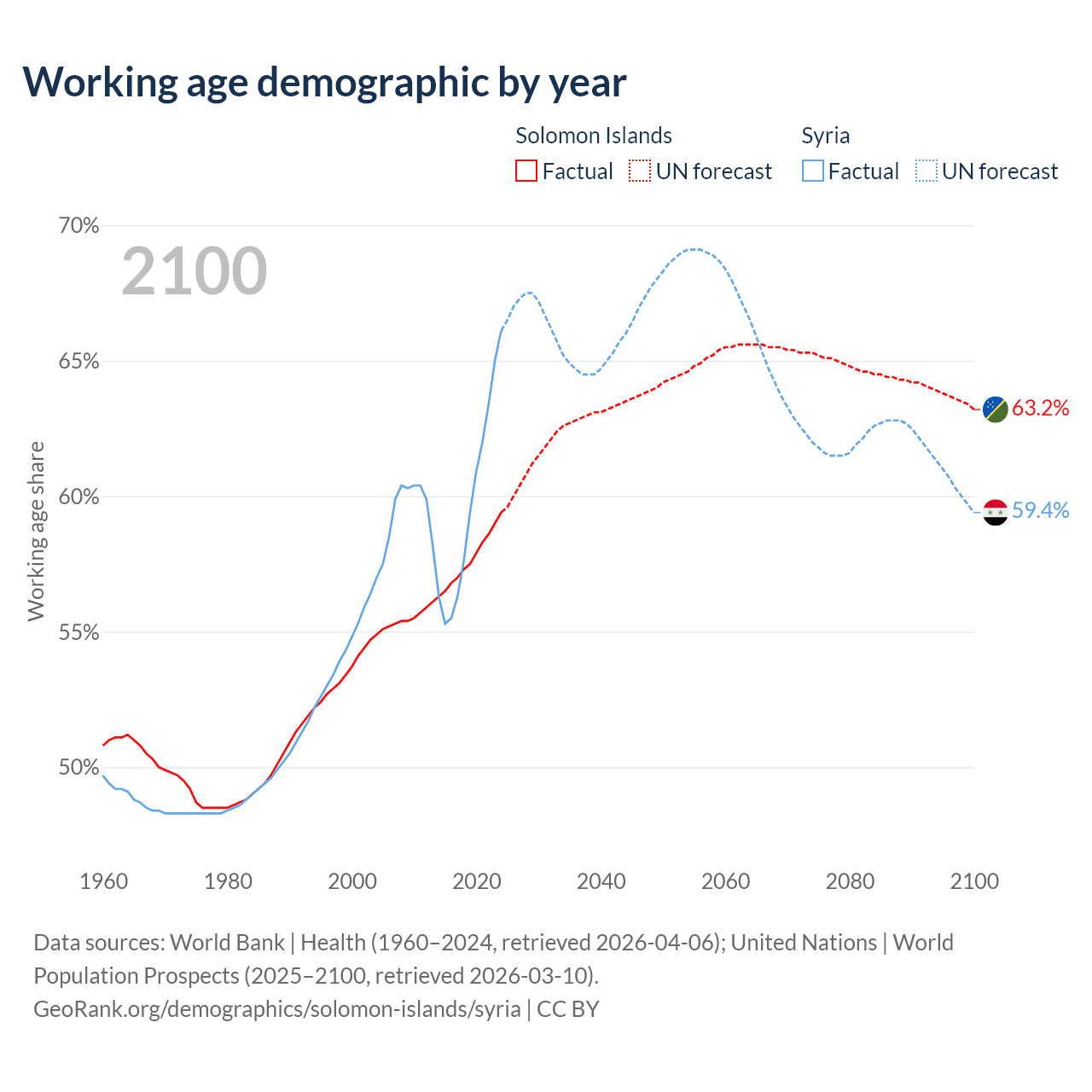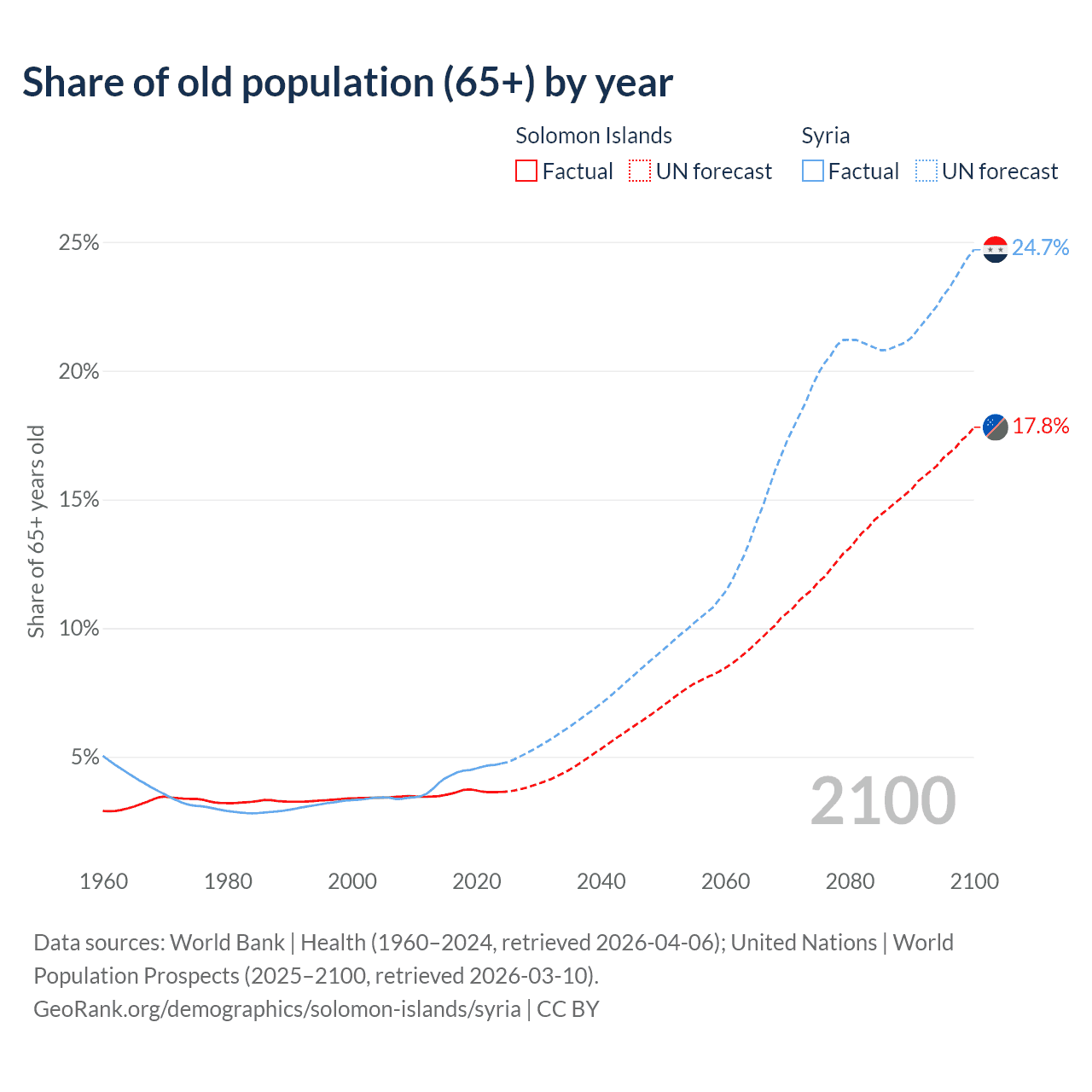The share of older people aged 65 and over is 3.64% in the Solomon Islands and 4.74% in Syria. Life expectancy in the Solomon Islands compared to Syria .