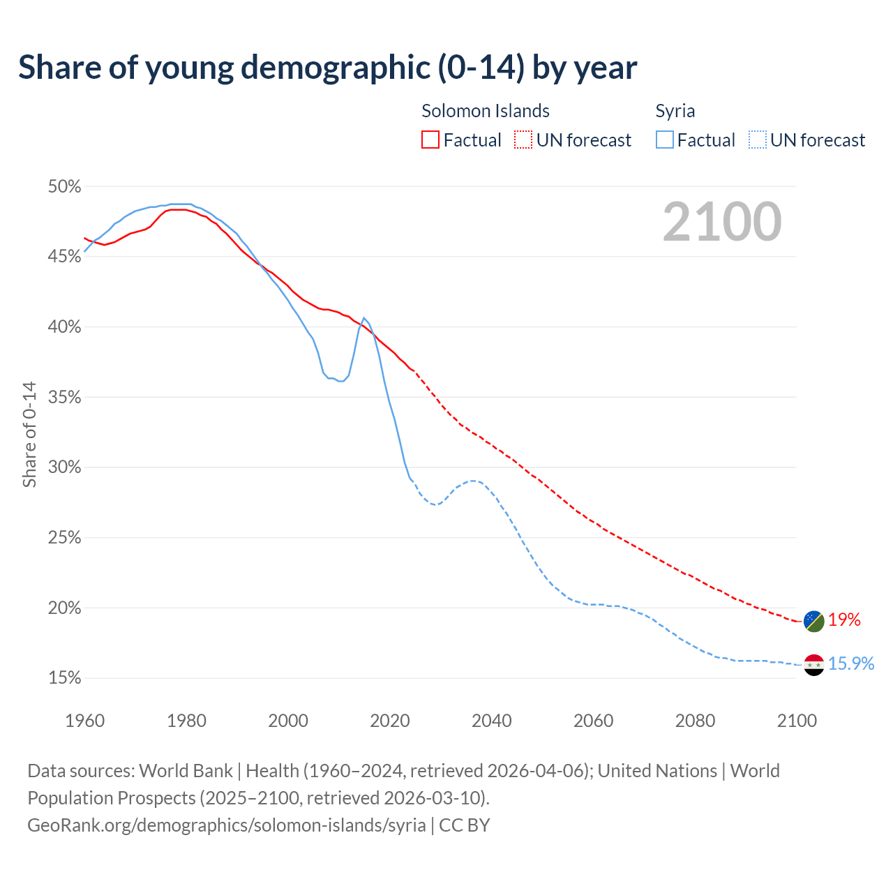 - The share of young demographic (0-15 years old) in the Solomon Islands is 37% vs 29.2% in Syria.