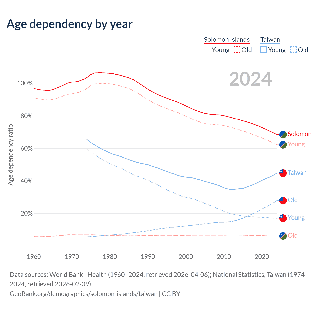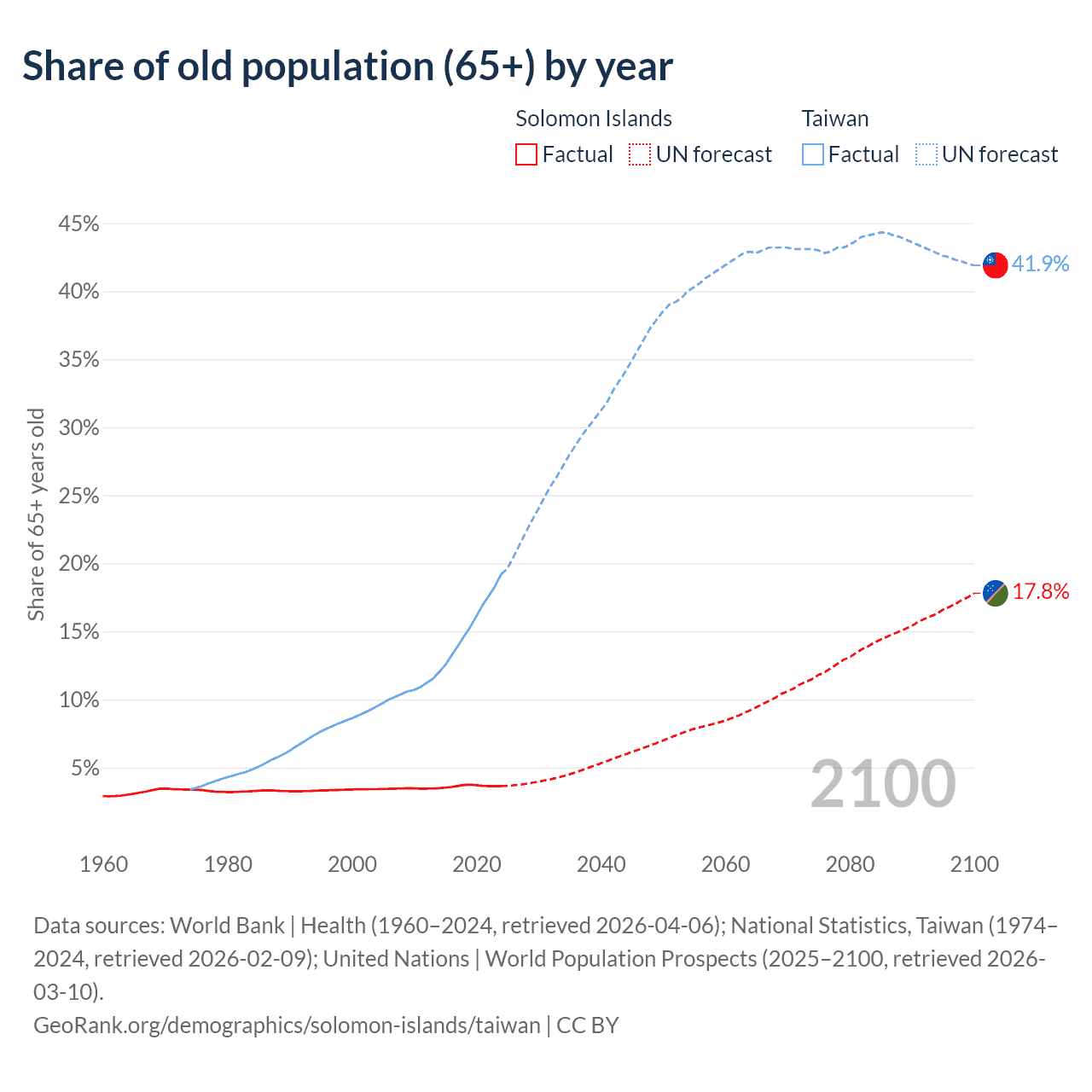 - The share of old-age demographic (65+) in the Solomon Islands is 3.64% vs 19.2% in Taiwan.
