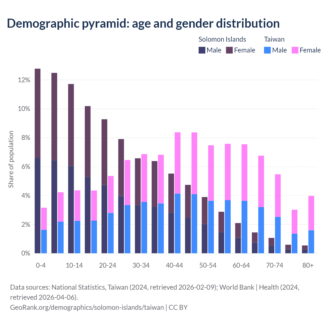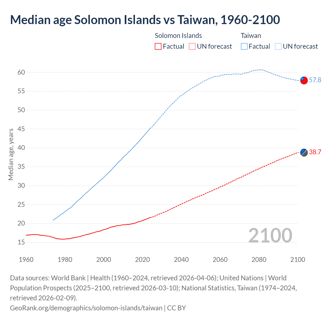 - The Solomon Islands is ranked 153/196 by median age (oldest to youngest) vs 16/196 for Taiwan.