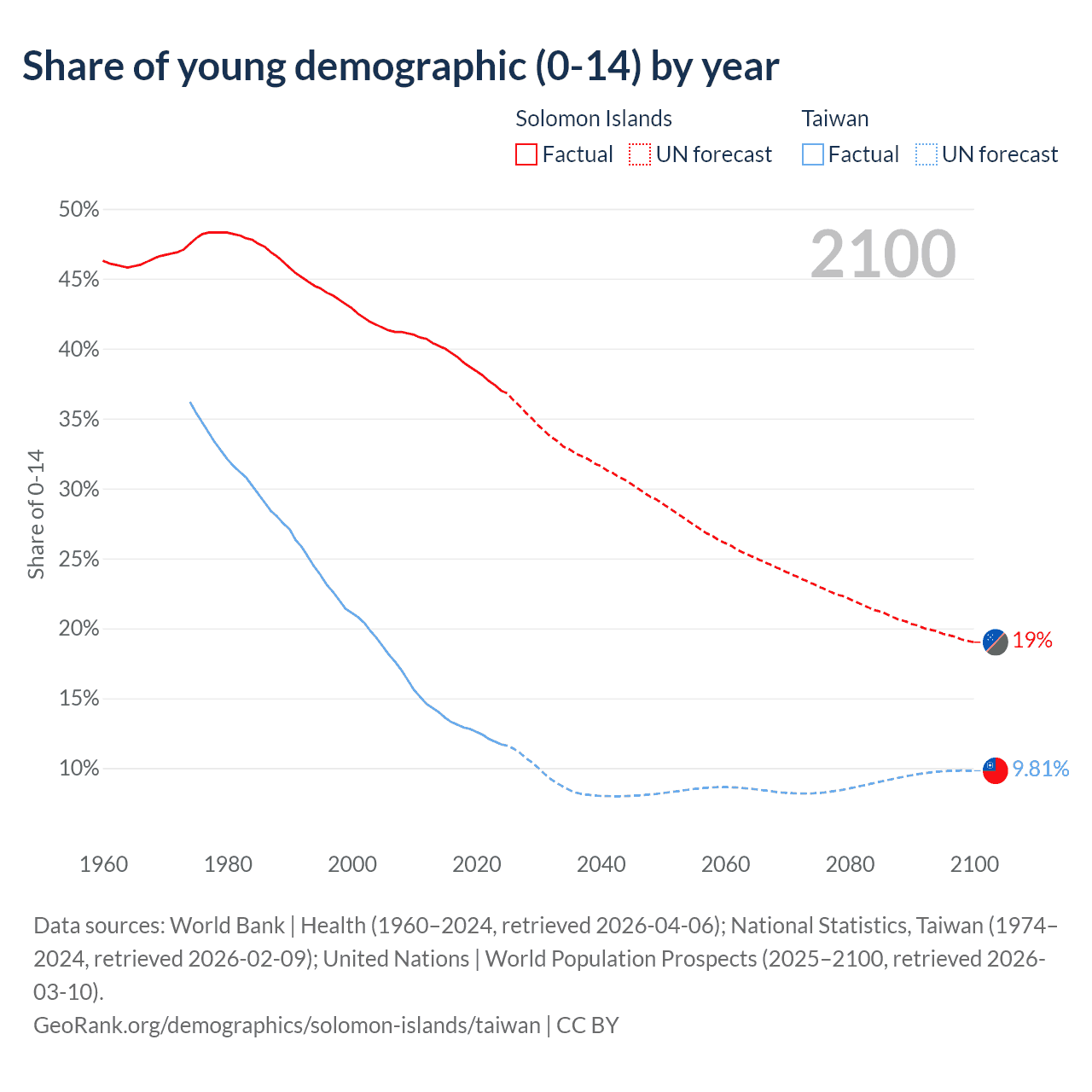 - The share of young demographic (0-15 years old) in the Solomon Islands is 37% vs 11.7% in Taiwan.