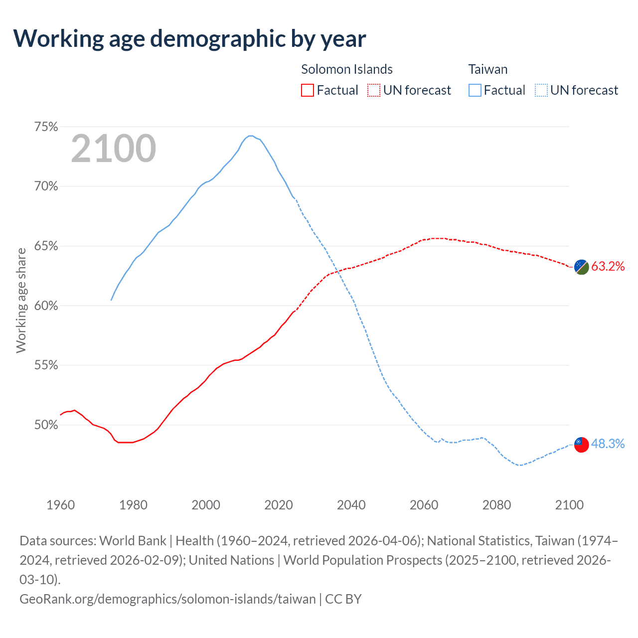 - The Solomon Islands has 513K working age adults (aged 15-64) vs 16.1M in Taiwan.