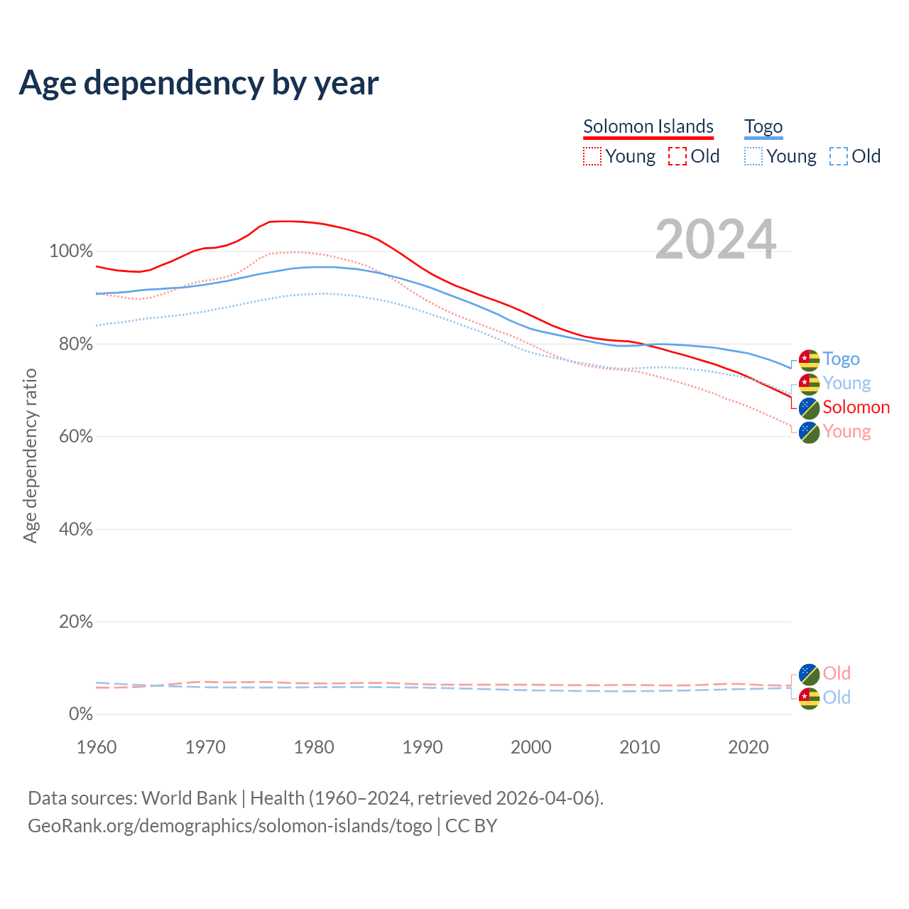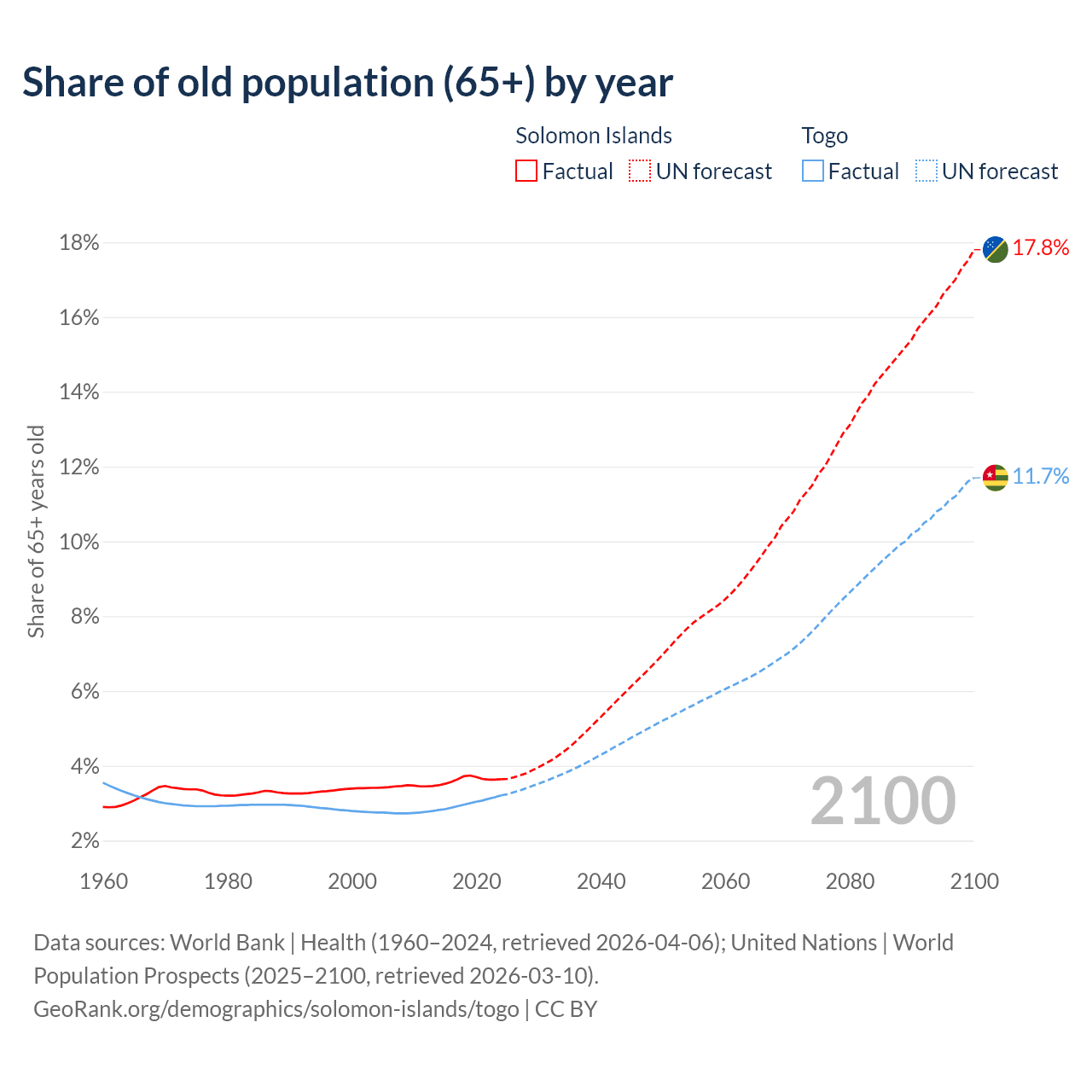 - The share of old-age demographic (65+) in the Solomon Islands is 3.64% vs 3.21% in Togo.