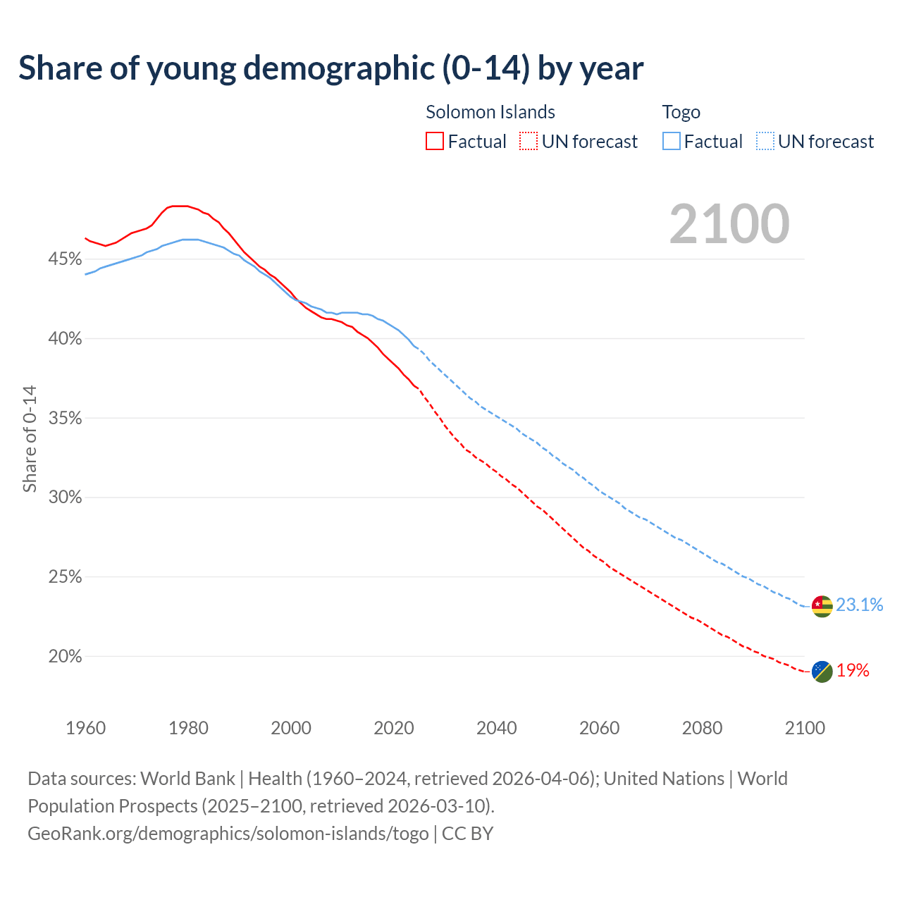 - The share of young demographic (0-15 years old) in the Solomon Islands is 37% vs 39.5% in Togo.