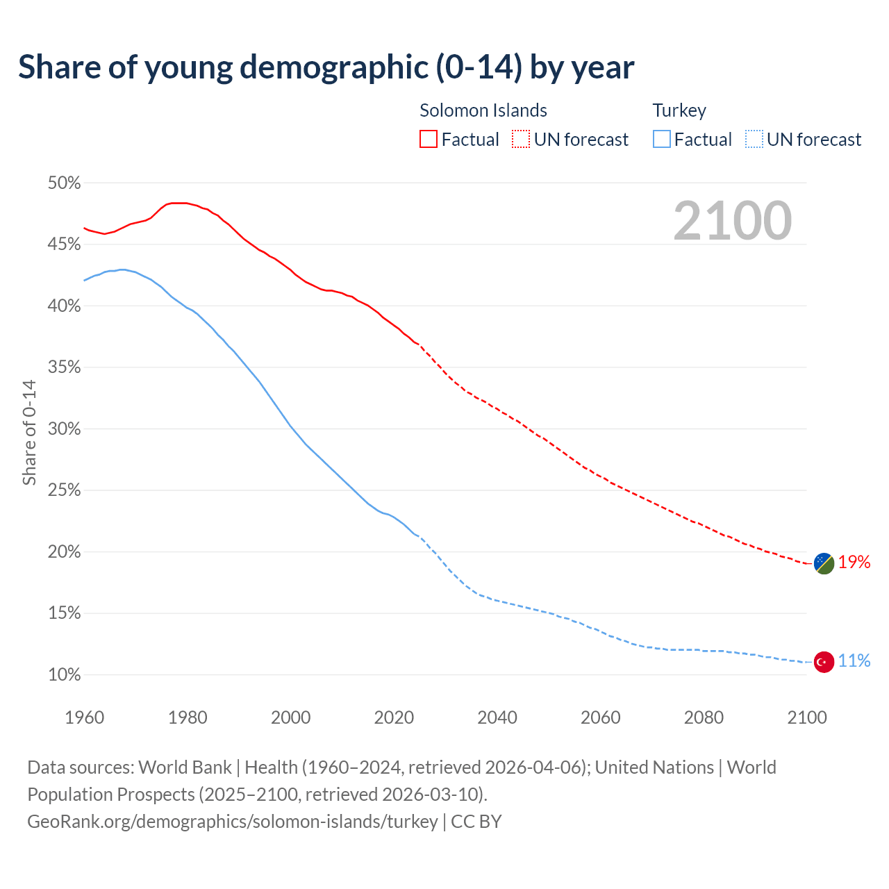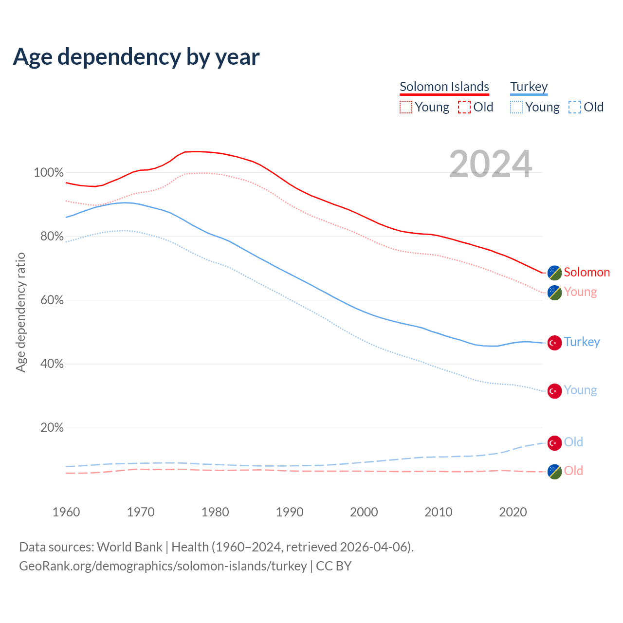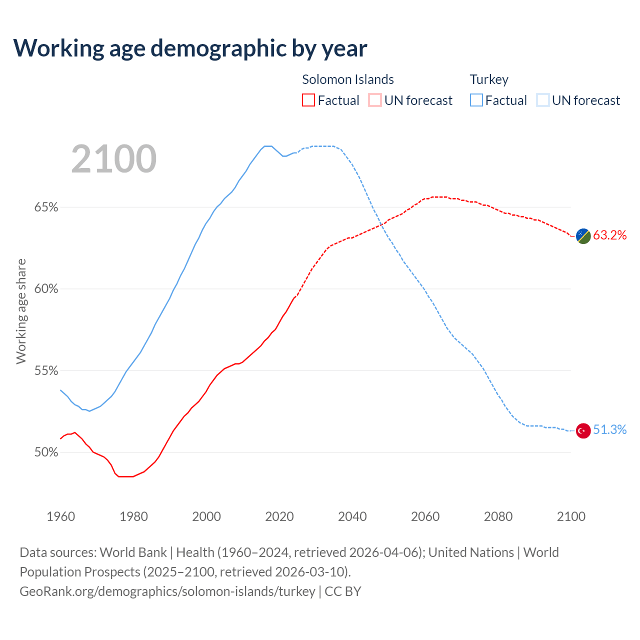 - The share of old-age demographic (65+) in the Solomon Islands is 3.64% vs 10.3% in Turkey.