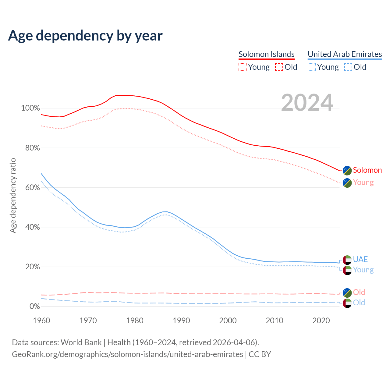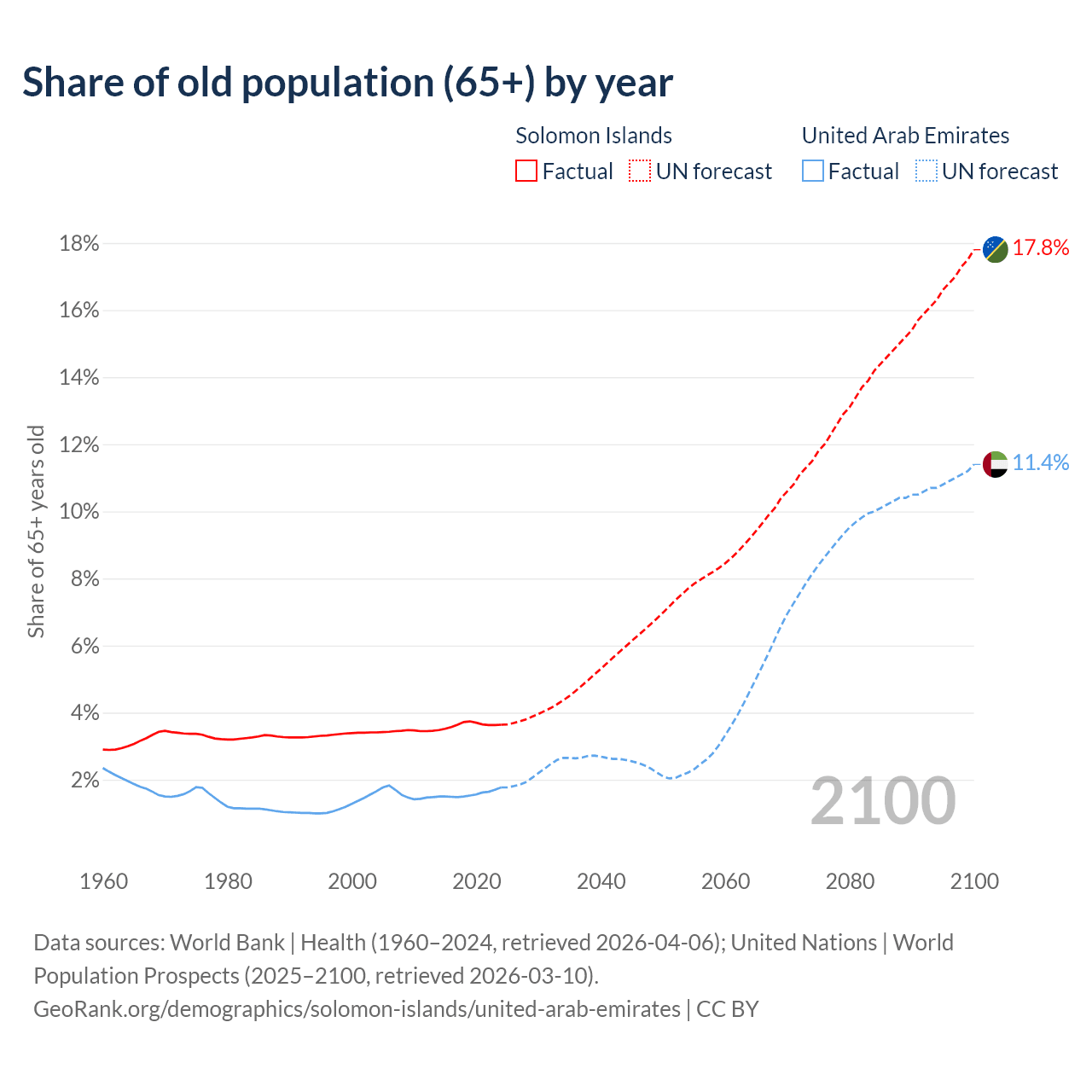 - The share of old-age demographic (65+) in the Solomon Islands is 3.64% vs 1.77% in the United Arab Emirates.