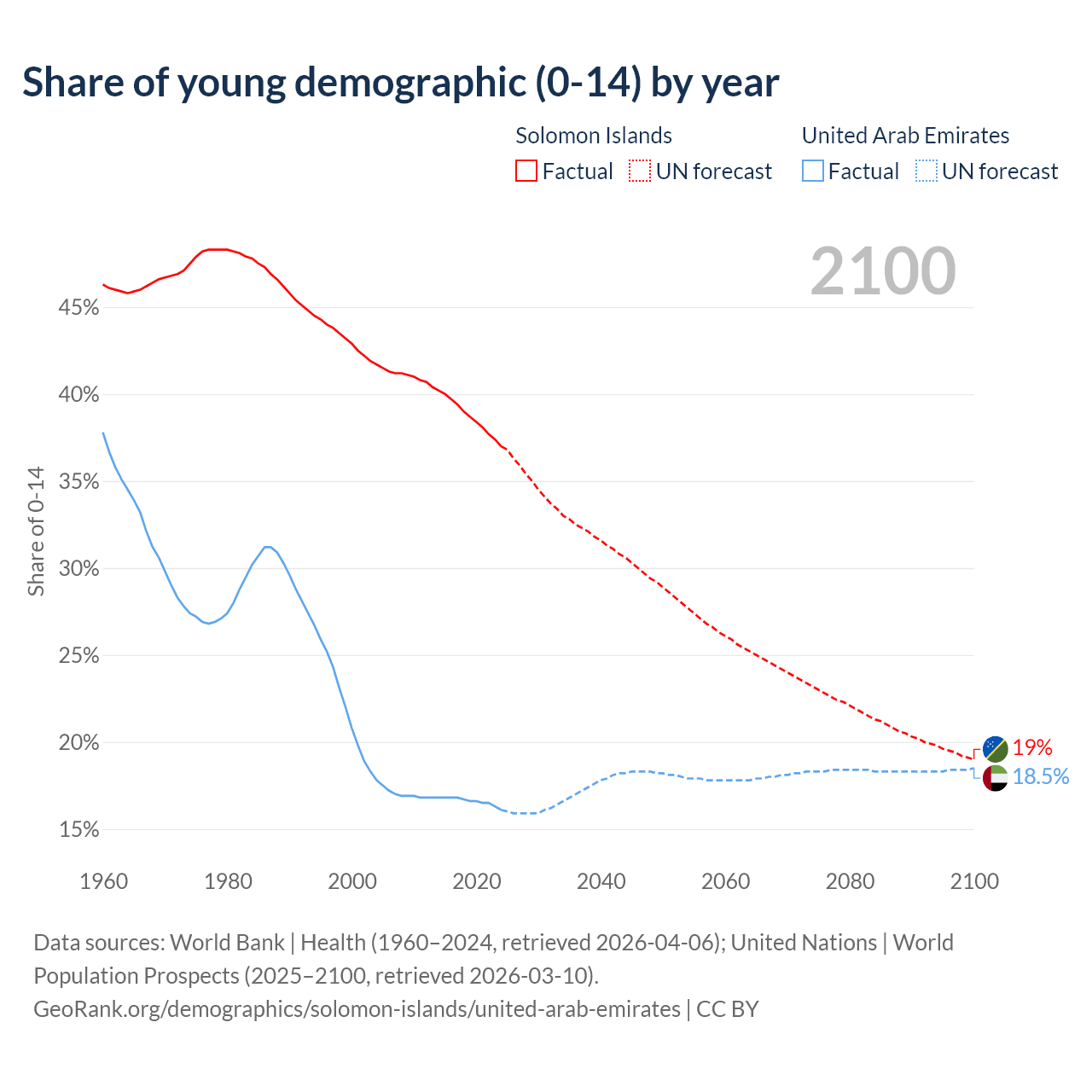 - The share of young demographic (0-15 years old) in the Solomon Islands is 37% vs 16.1% in the United Arab Emirates.