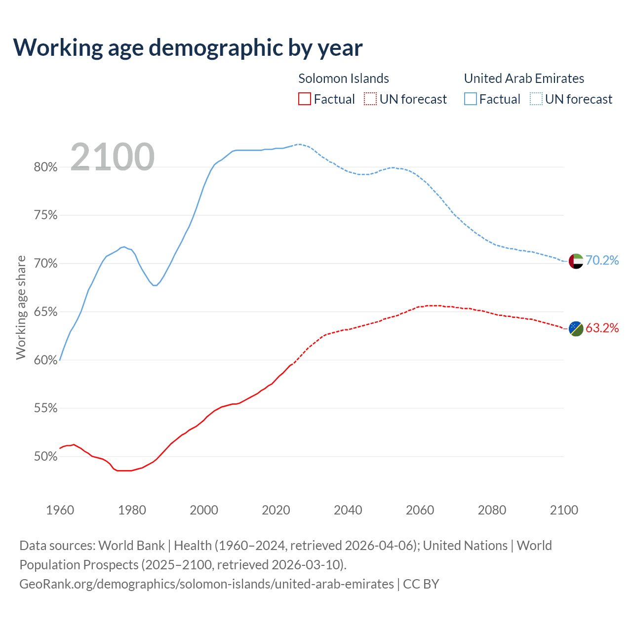 - The Solomon Islands has 513K working age adults (aged 15-64) vs 9.6M in the United Arab Emirates.