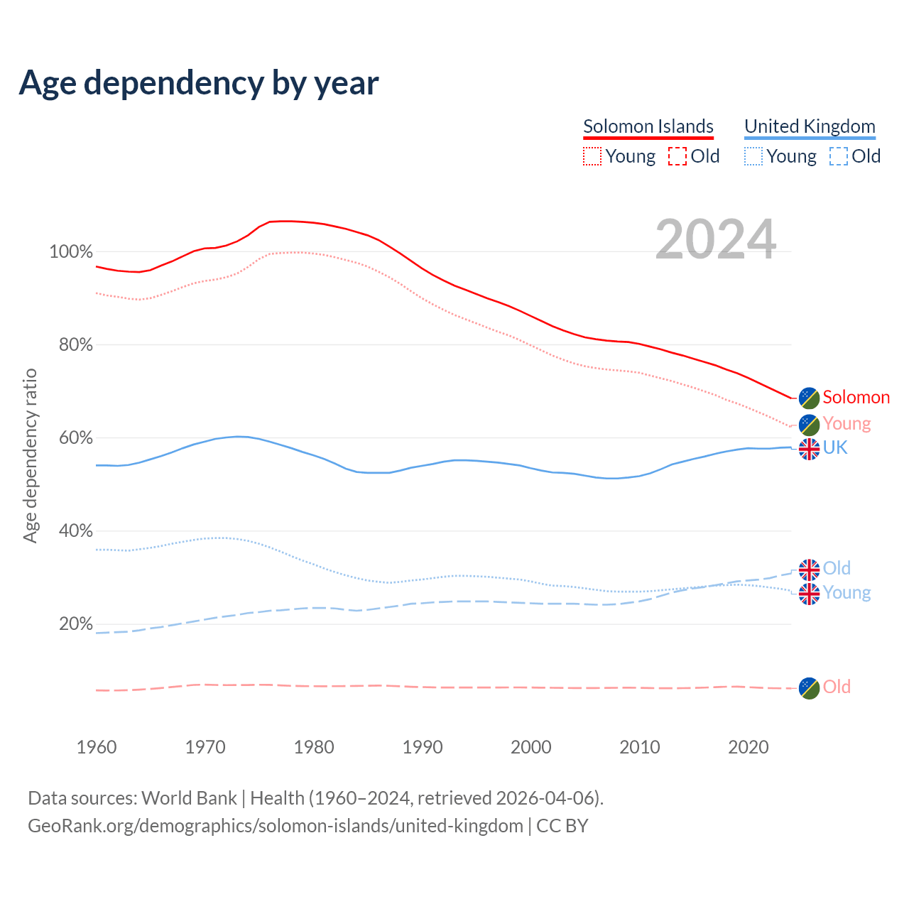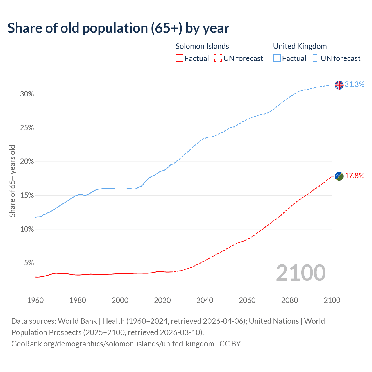 - The share of old-age demographic (65+) in the Solomon Islands is 3.64% vs 19.5% in the United Kingdom.