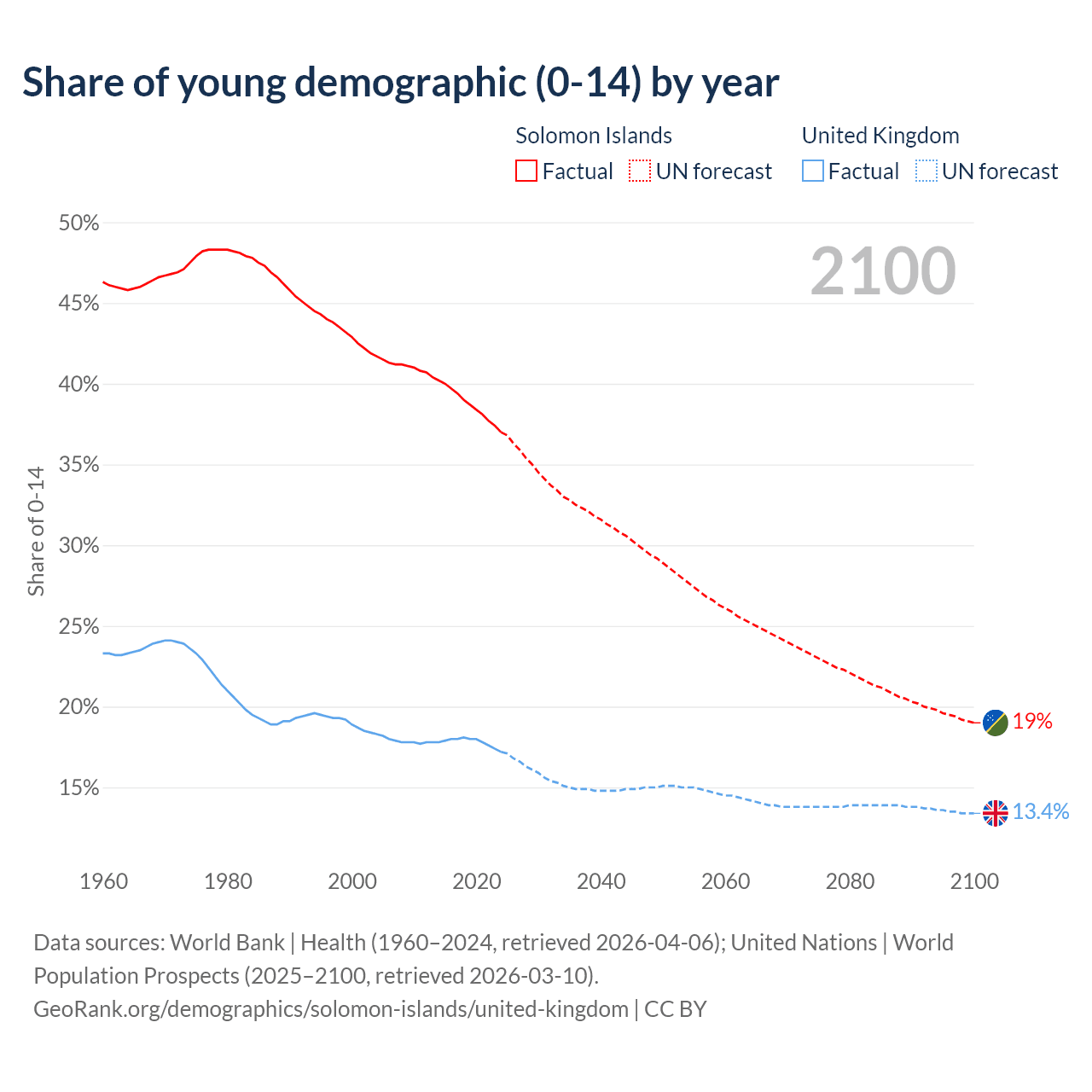 - The share of young demographic (0-15 years old) in the Solomon Islands is 37% vs 17.2% in the United Kingdom.