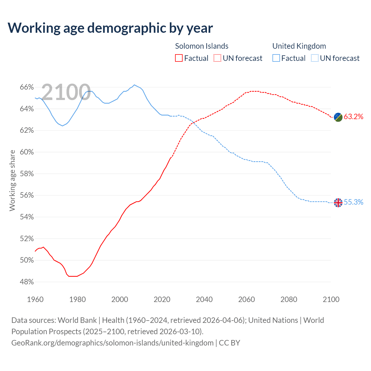 - The Solomon Islands has 513K working age adults (aged 15-64) vs 44.4M in the United Kingdom.
