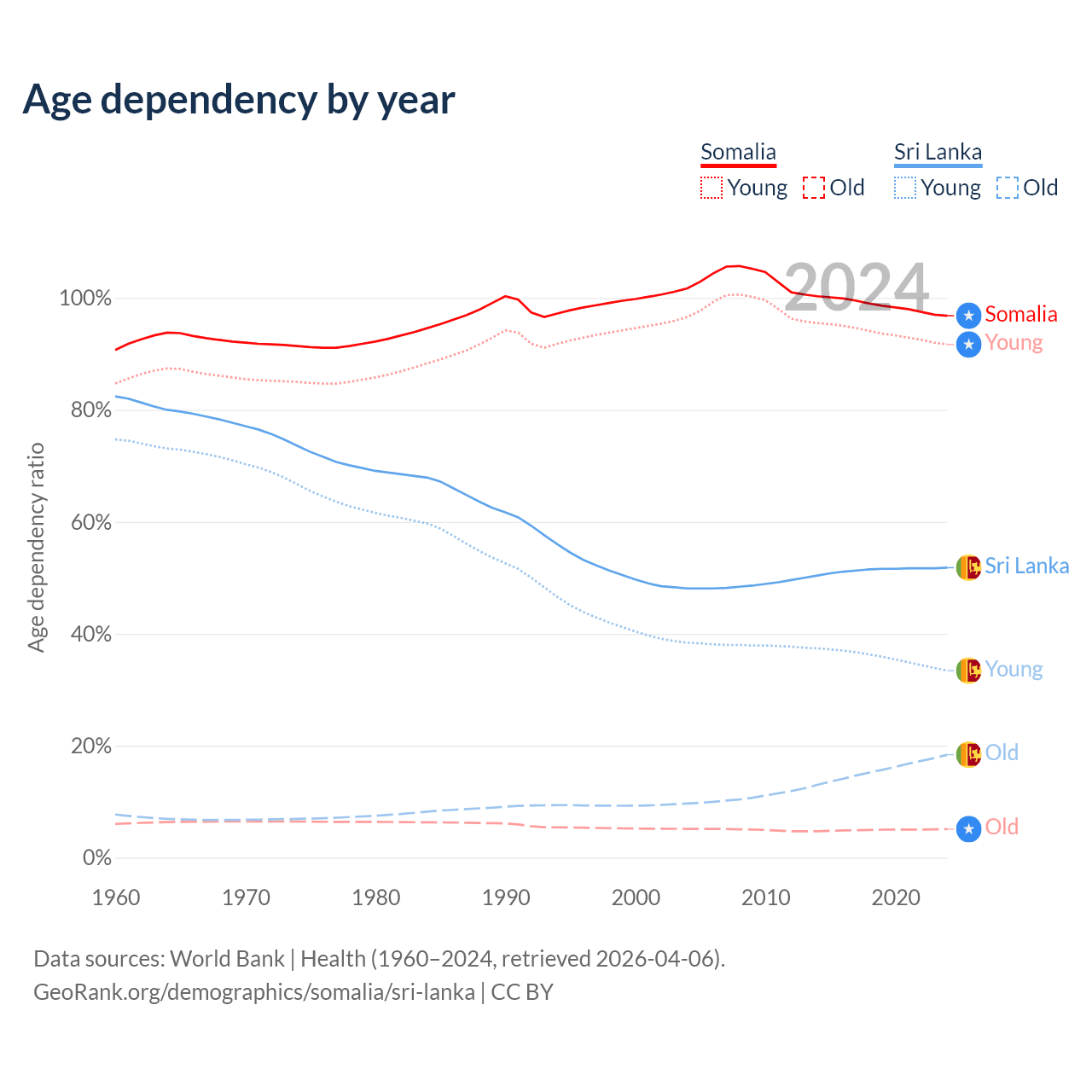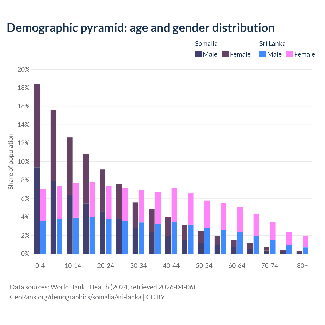 - Somalia is ranked 194/196 by median age (oldest to youngest) vs 81/196 for Sri Lanka.