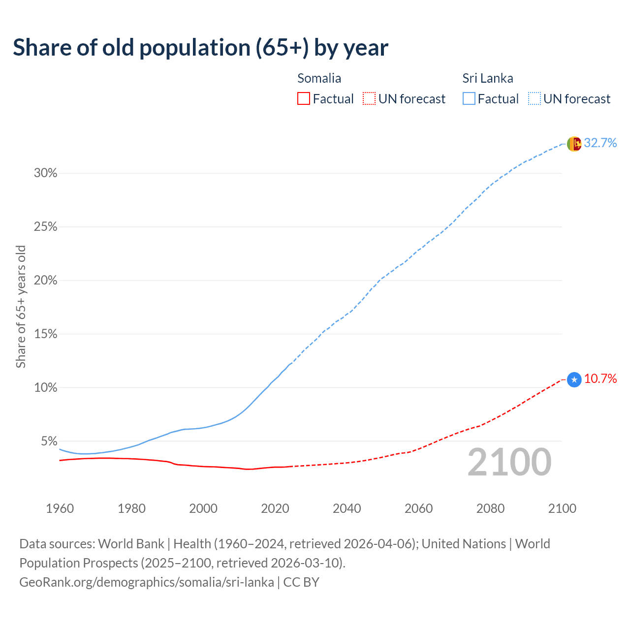 - The share of old-age demographic (65+) in Somalia is 2.59% vs 12.1% in Sri Lanka.