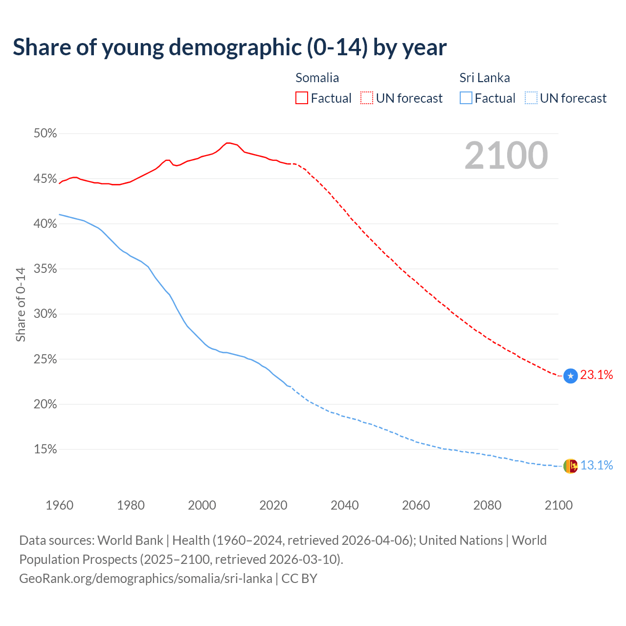 - The share of young demographic (0-15 years old) in Somalia is 46.6% vs 22% in Sri Lanka.