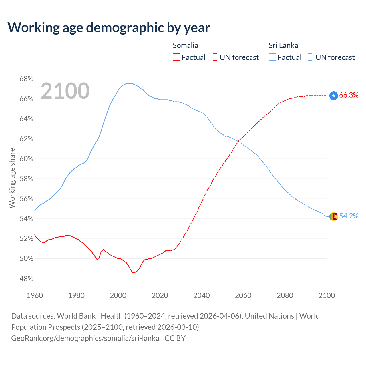 - Somalia has 10.4M working age adults (aged 15-64) vs 14.6M in Sri Lanka.