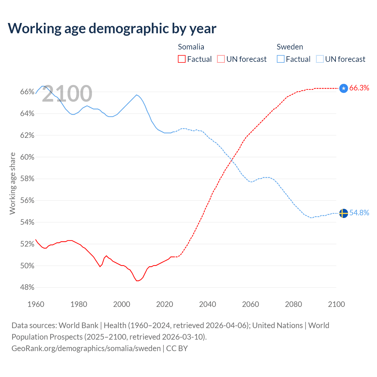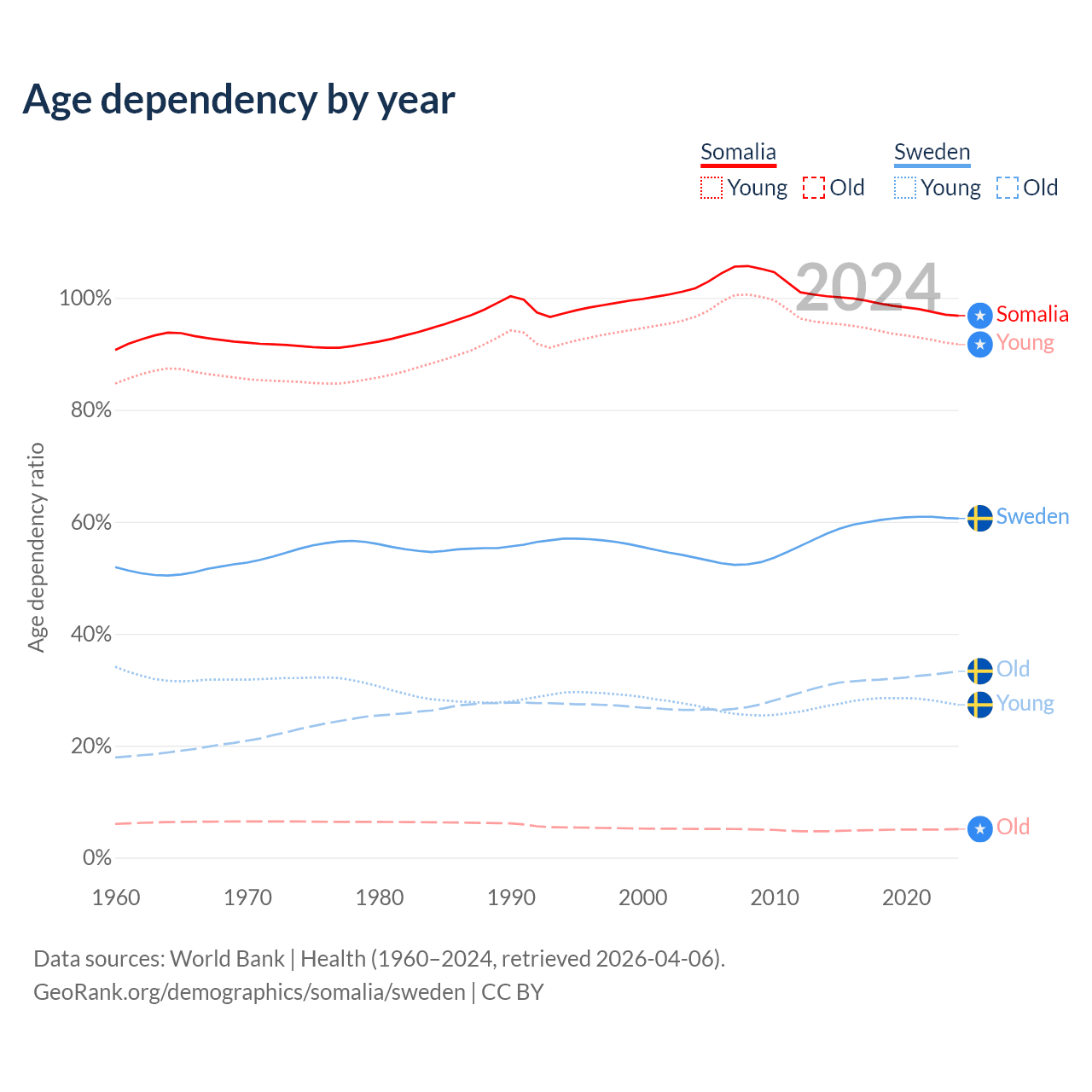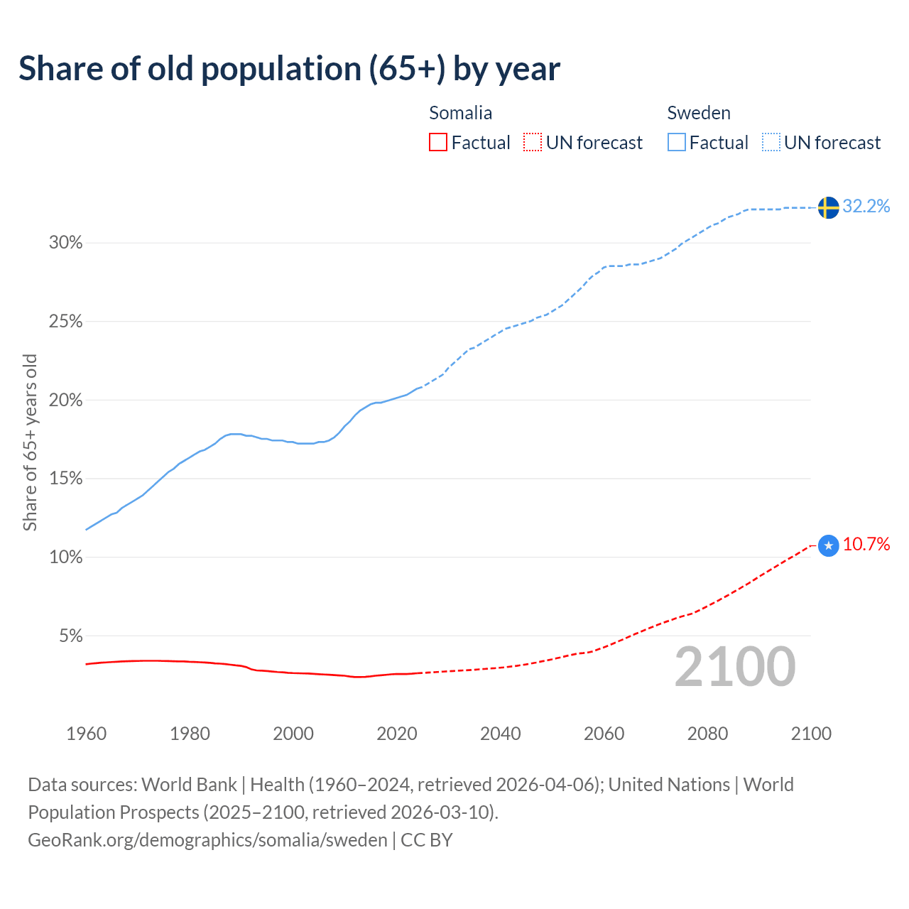 - The share of old-age demographic (65+) in Somalia is 2.59% vs 20.7% in Sweden.