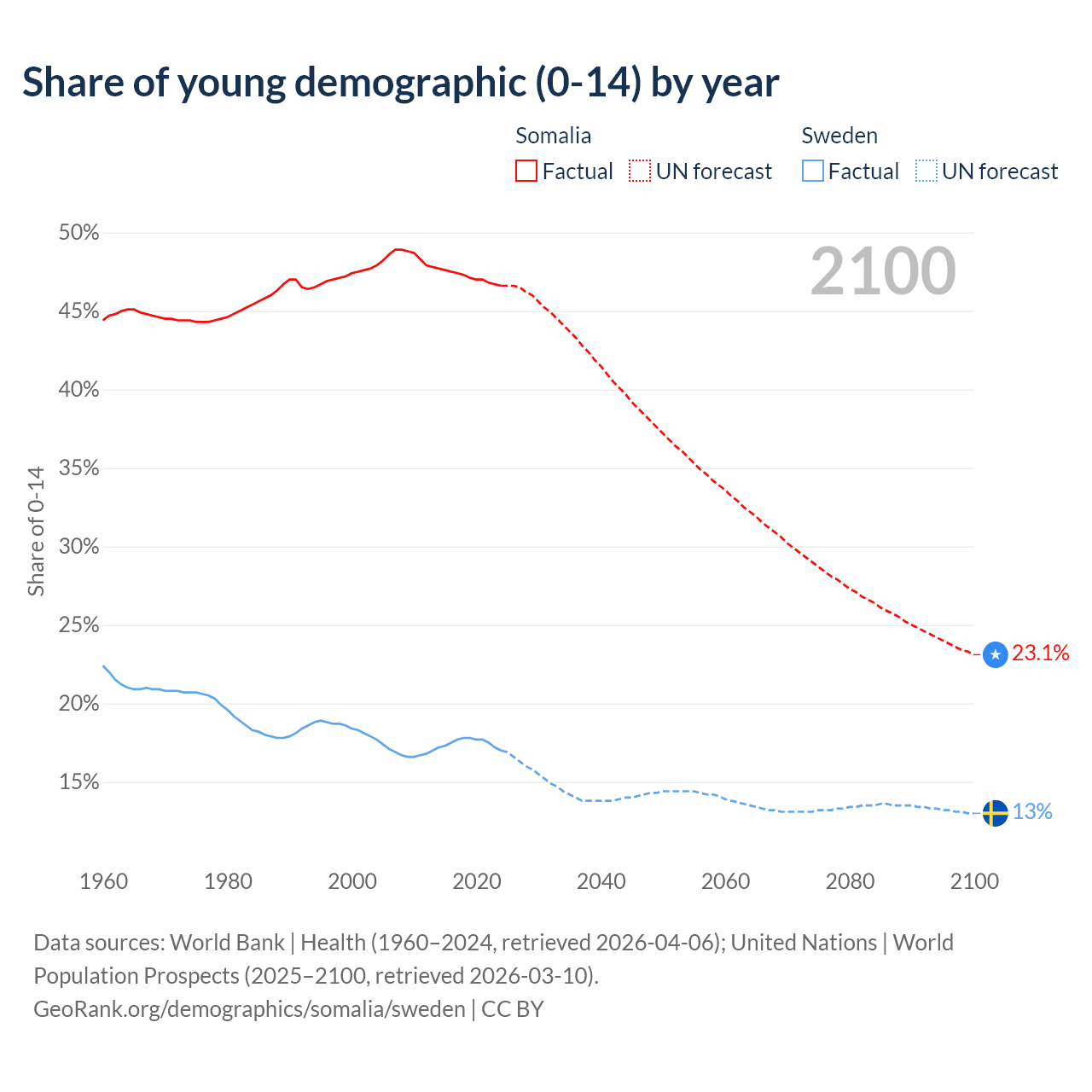 - The share of young demographic (0-15 years old) in Somalia is 46.6% vs 17% in Sweden.
