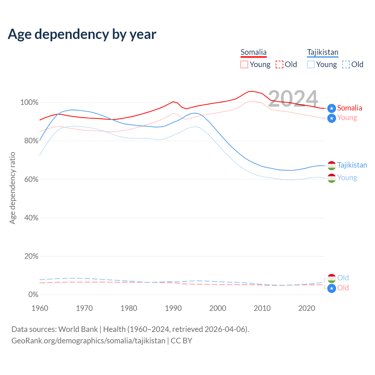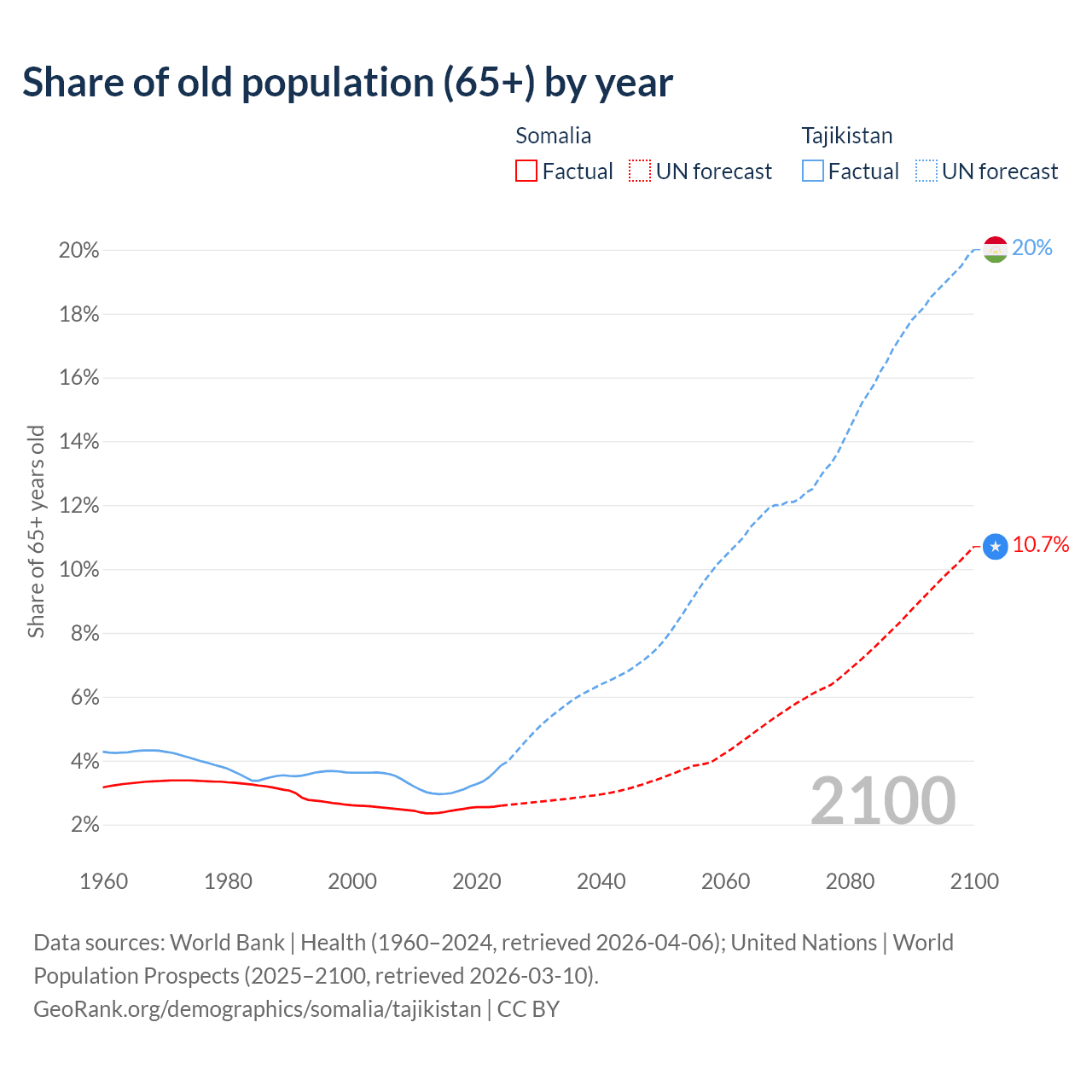 - The share of old-age demographic (65+) in Somalia is 2.59% vs 3.85% in Tajikistan.
