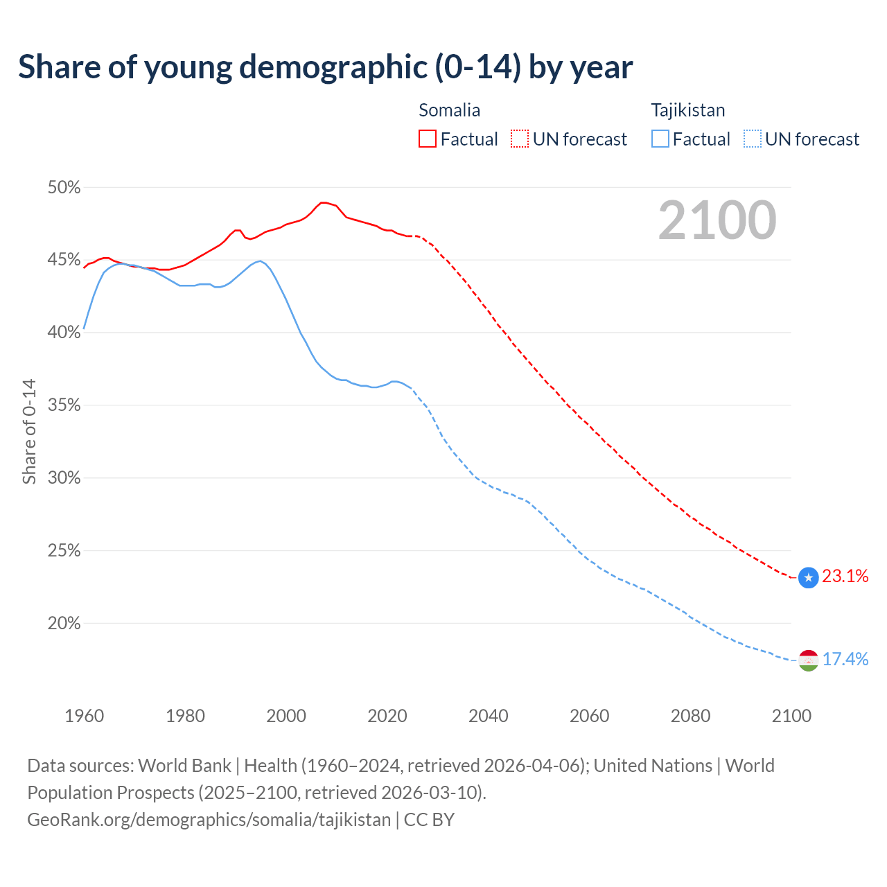 - The share of young demographic (0-15 years old) in Somalia is 46.6% vs 36.3% in Tajikistan.