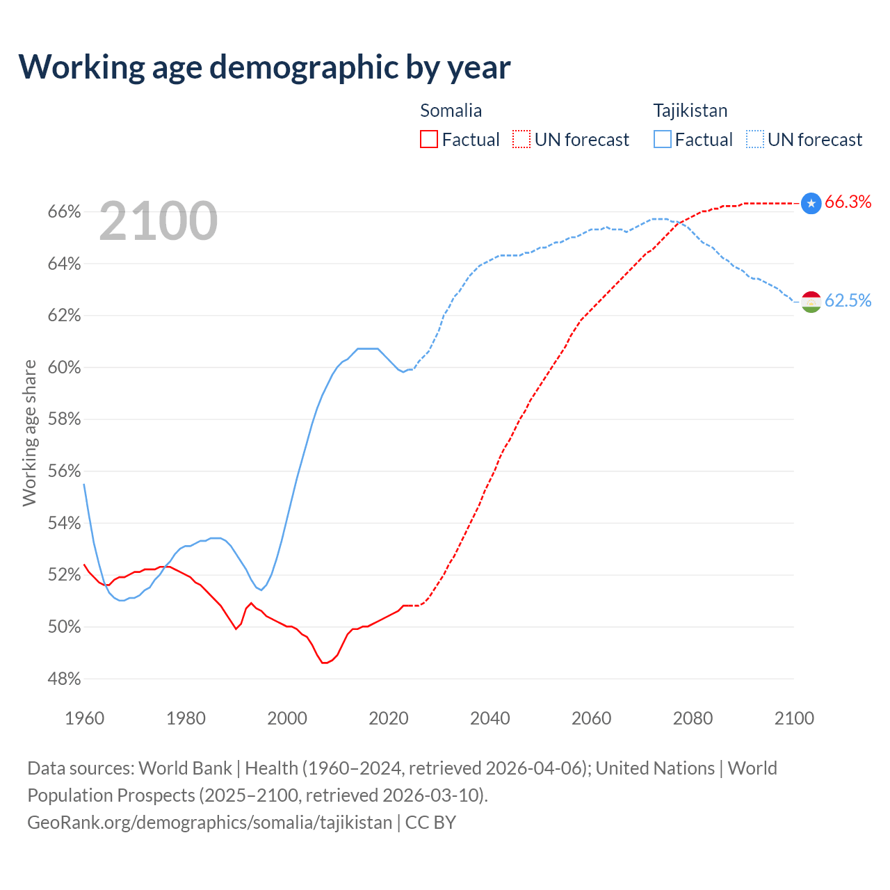 - Somalia has 10.4M working age adults (aged 15-64) vs 6.61M in Tajikistan.