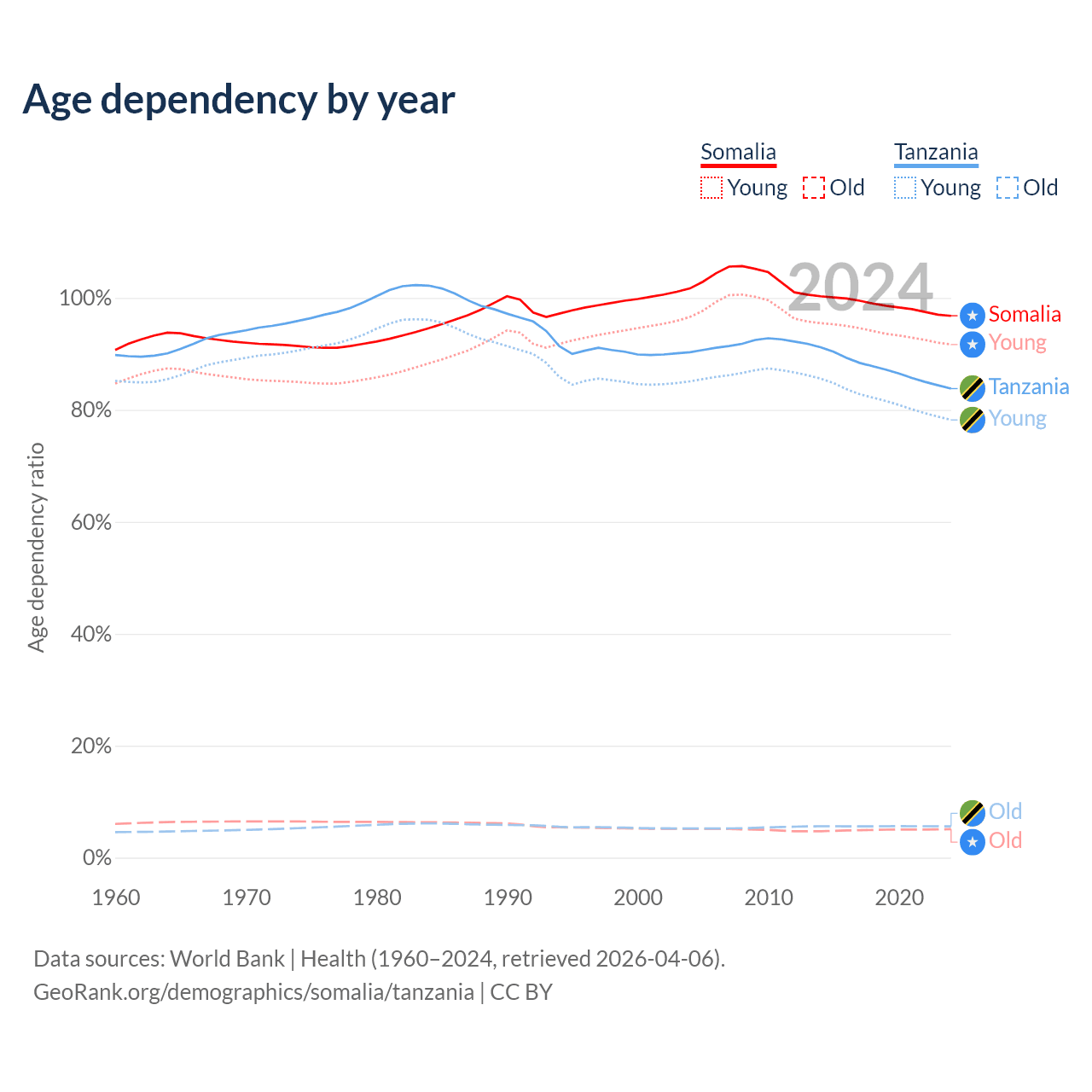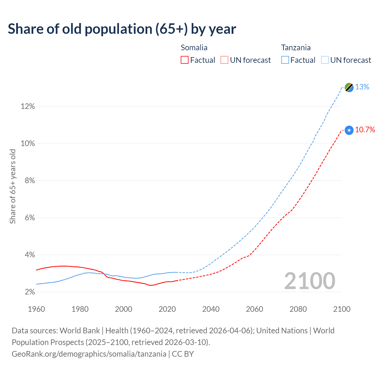 The share of older people aged 65 and over is 2.59% in Somalia and 3.05% in Tanzania. Life expectancy in Somalia compared to Tanzania .