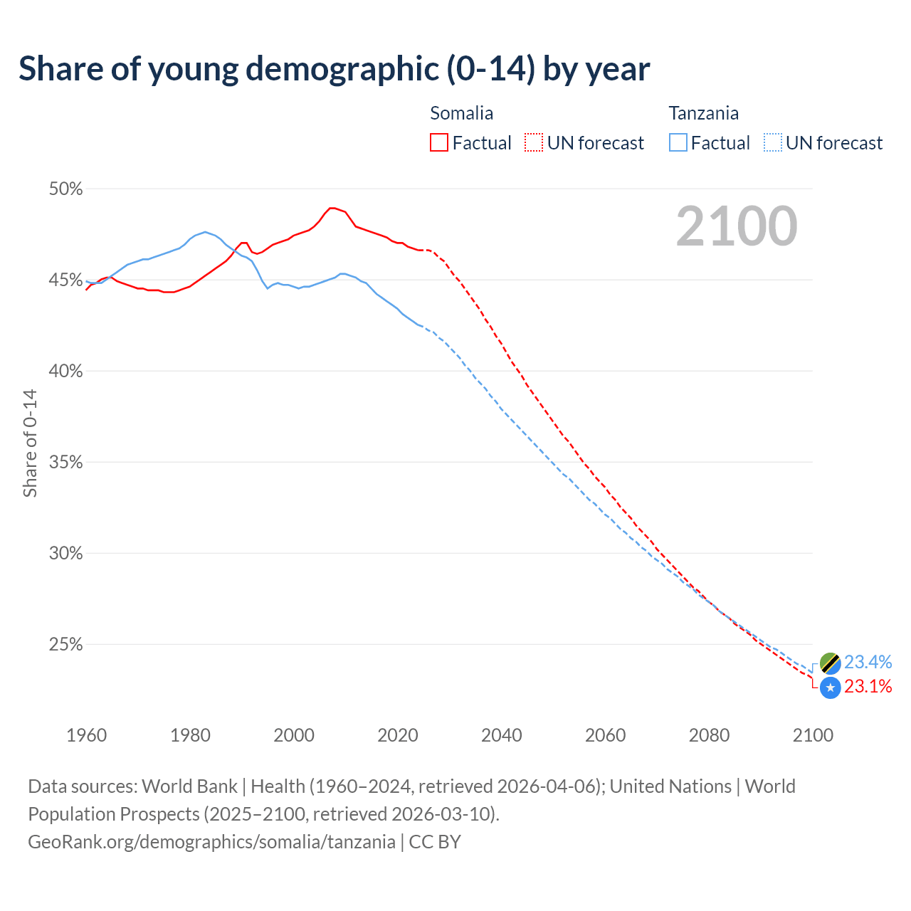 - The share of young demographic (0-15 years old) in Somalia is 46.6% vs 42.5% in Tanzania.