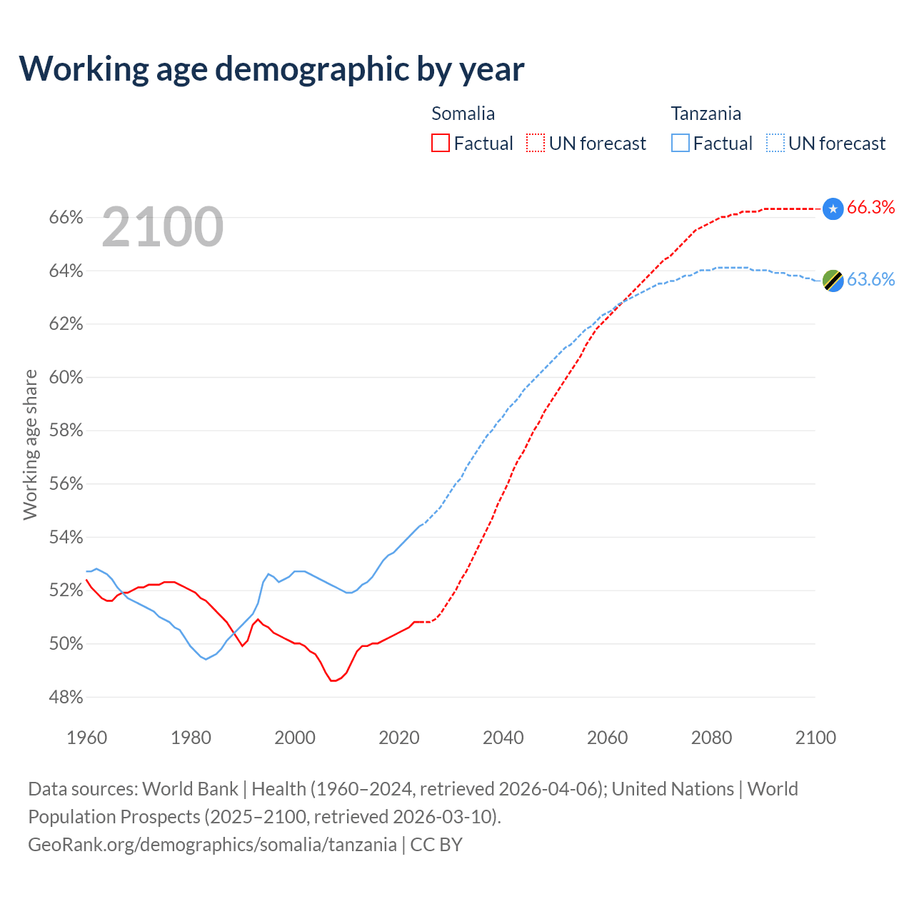 Median age Somalia vs Tanzania, 1960-2100