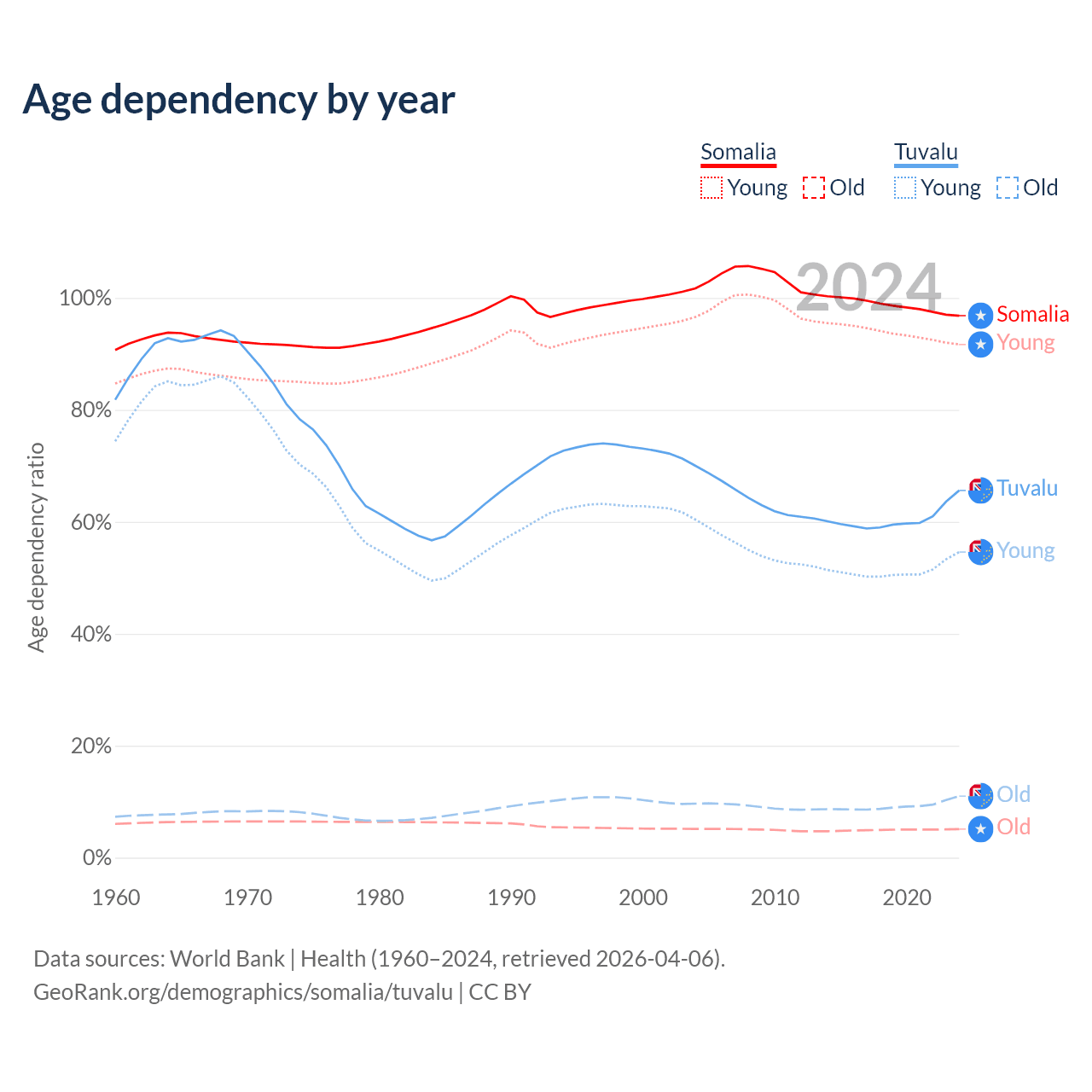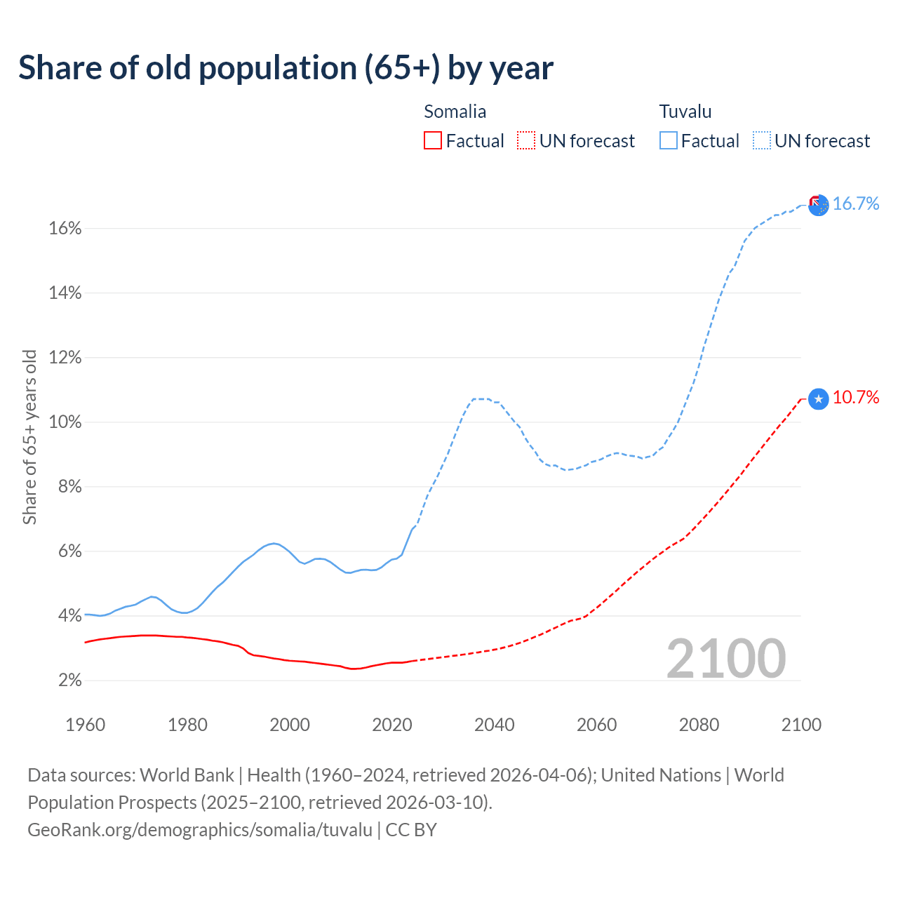 - The share of old-age demographic (65+) in Somalia is 2.59% vs 6.67% in Tuvalu.