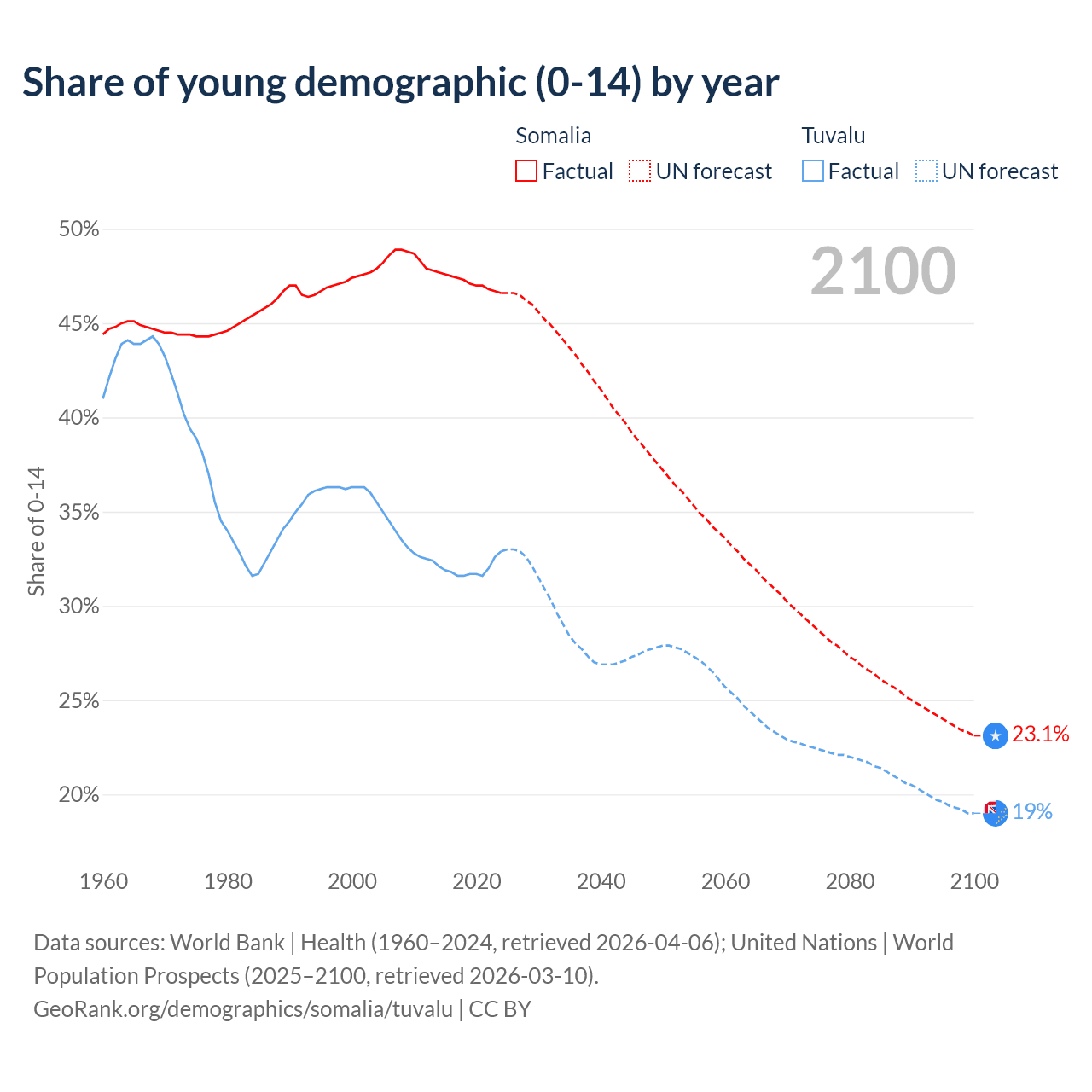 - The share of young demographic (0-15 years old) in Somalia is 46.6% vs 32.9% in Tuvalu.
