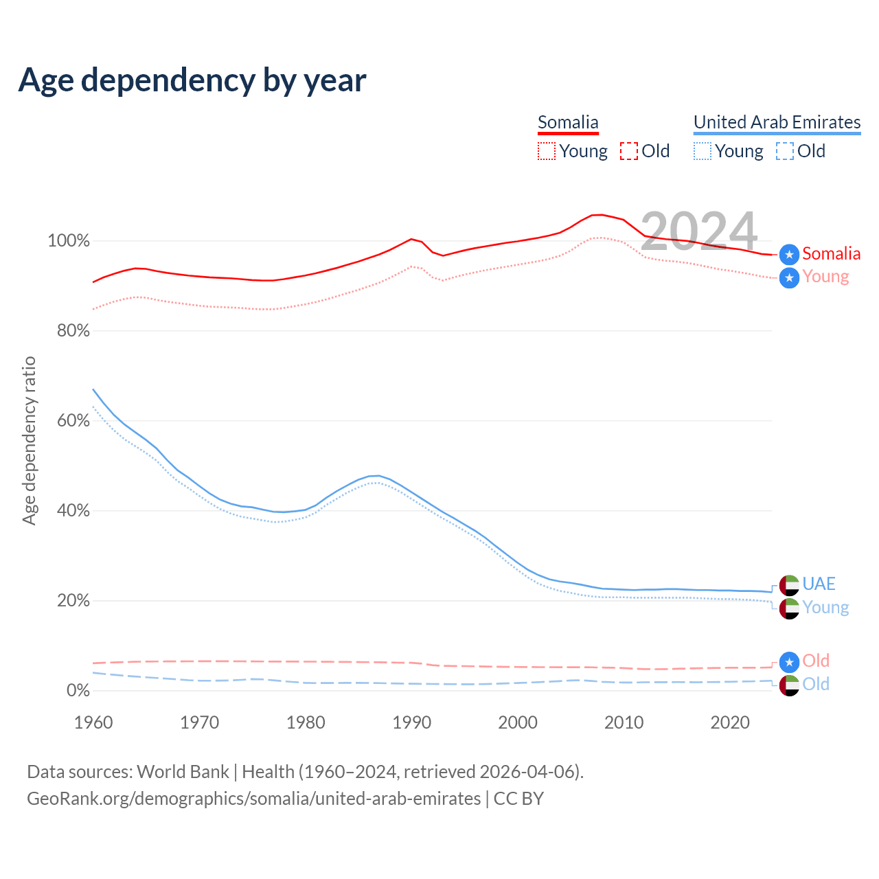 - The share of old-age demographic (65+) in Somalia is 2.59% vs 1.77% in the United Arab Emirates.