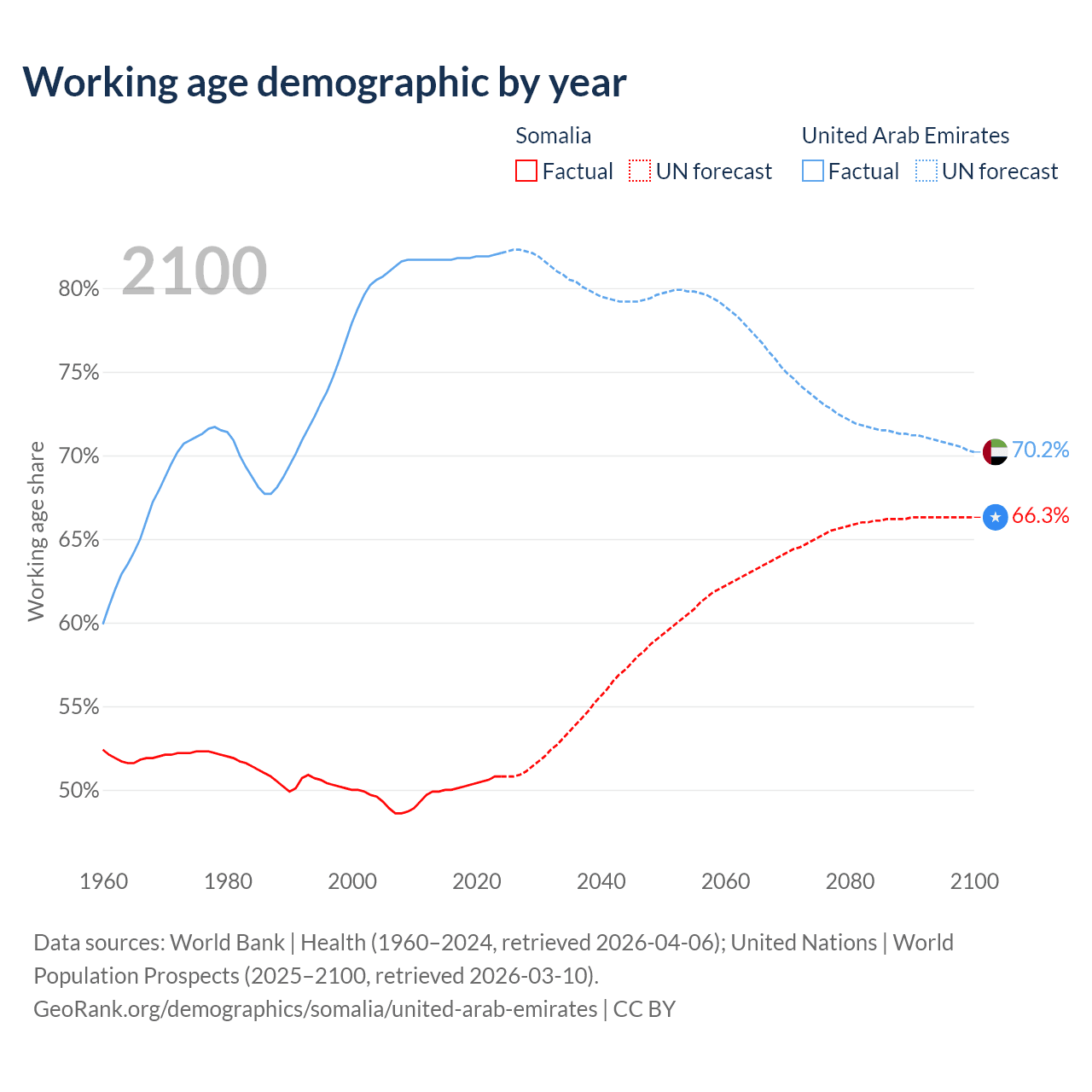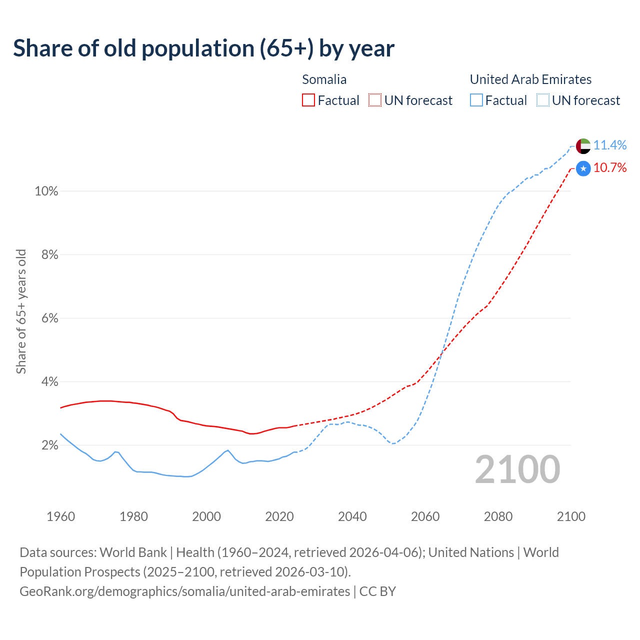 The share of older people aged 65 and over is 2.59% in Somalia and 1.77% in the United Arab Emirates. Life expectancy in Somalia compared to the United Arab Emirates .