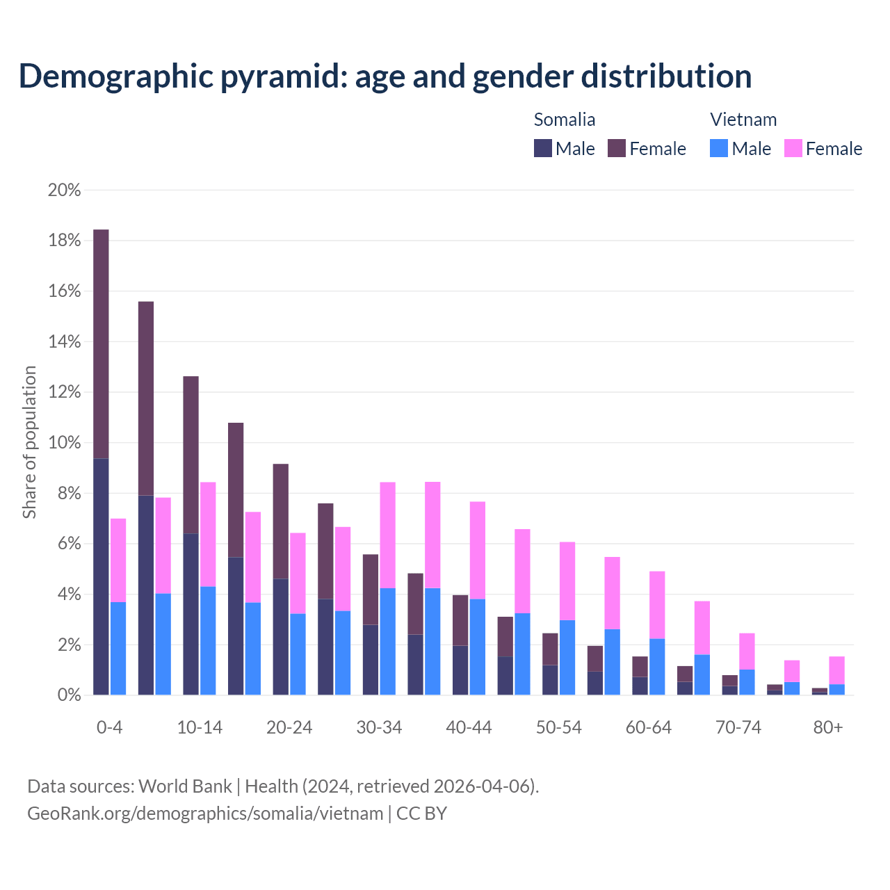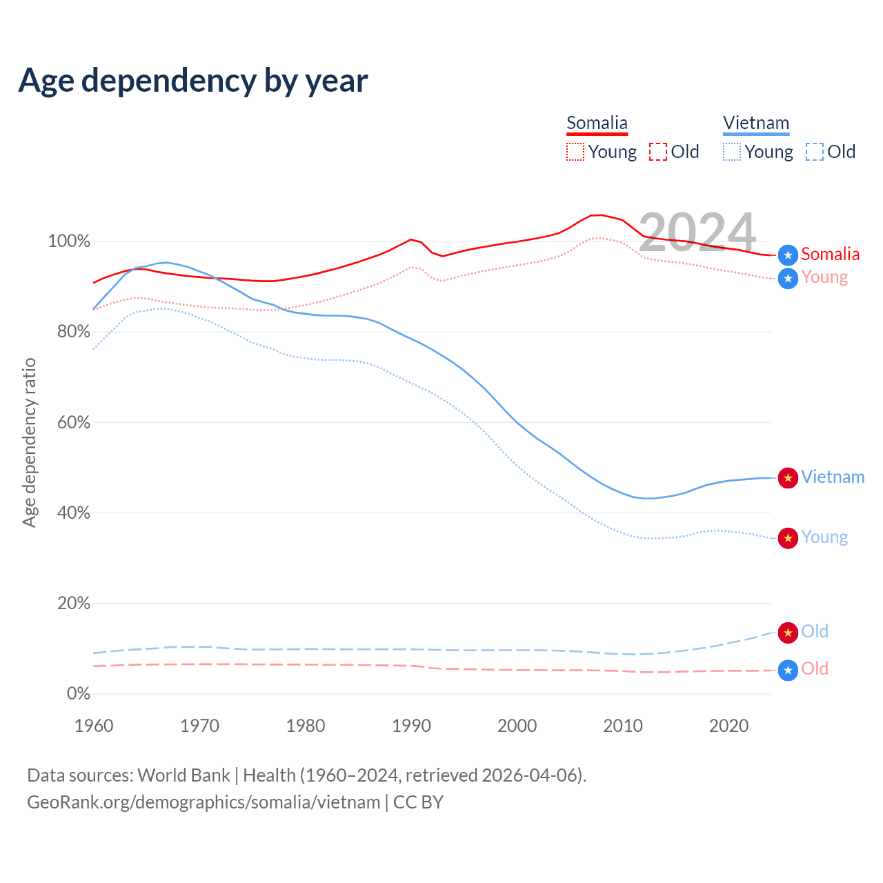 - Somalia is ranked 194/196 by median age (oldest to youngest) vs 84/196 for Vietnam.