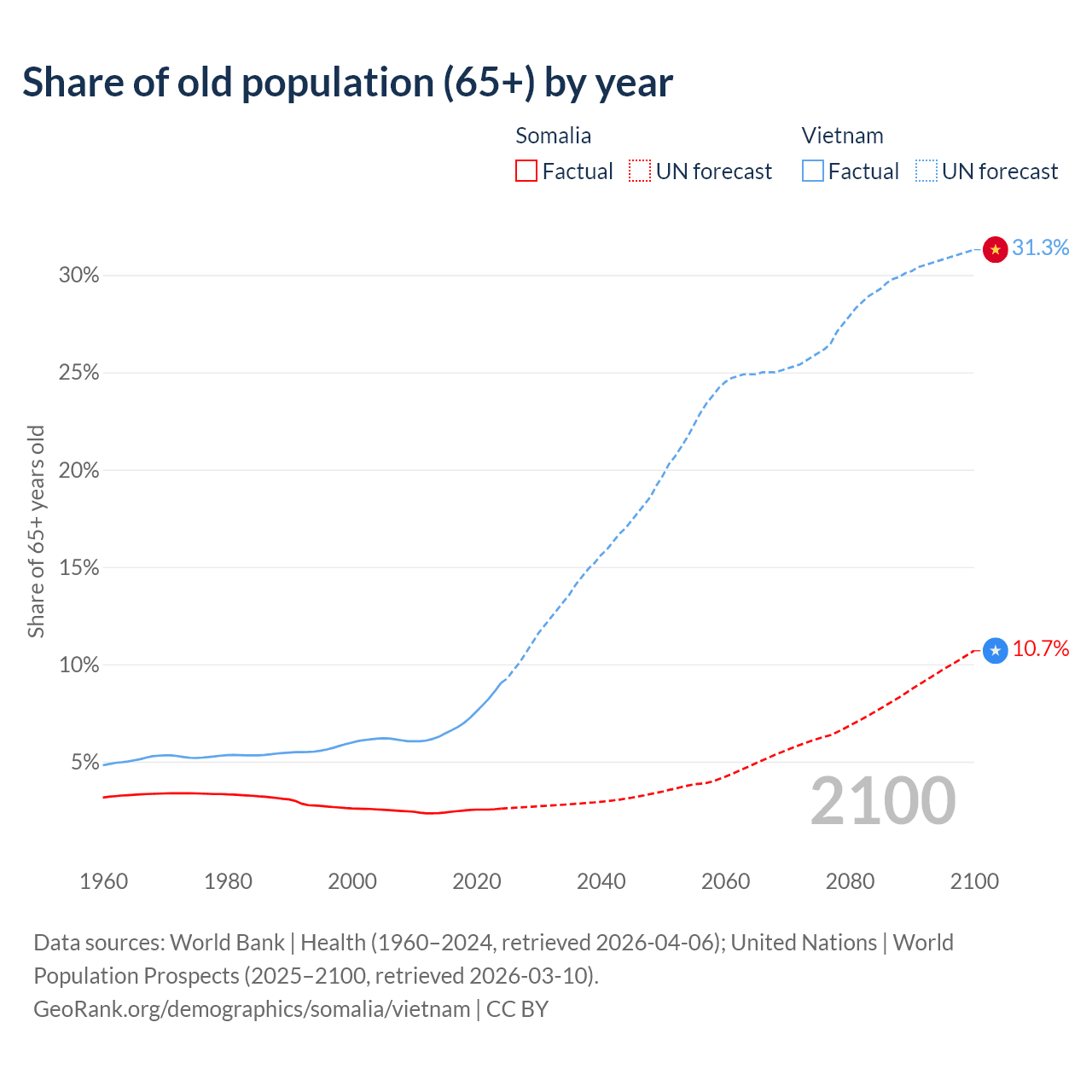 - The share of old-age demographic (65+) in Somalia is 2.59% vs 9.05% in Vietnam.