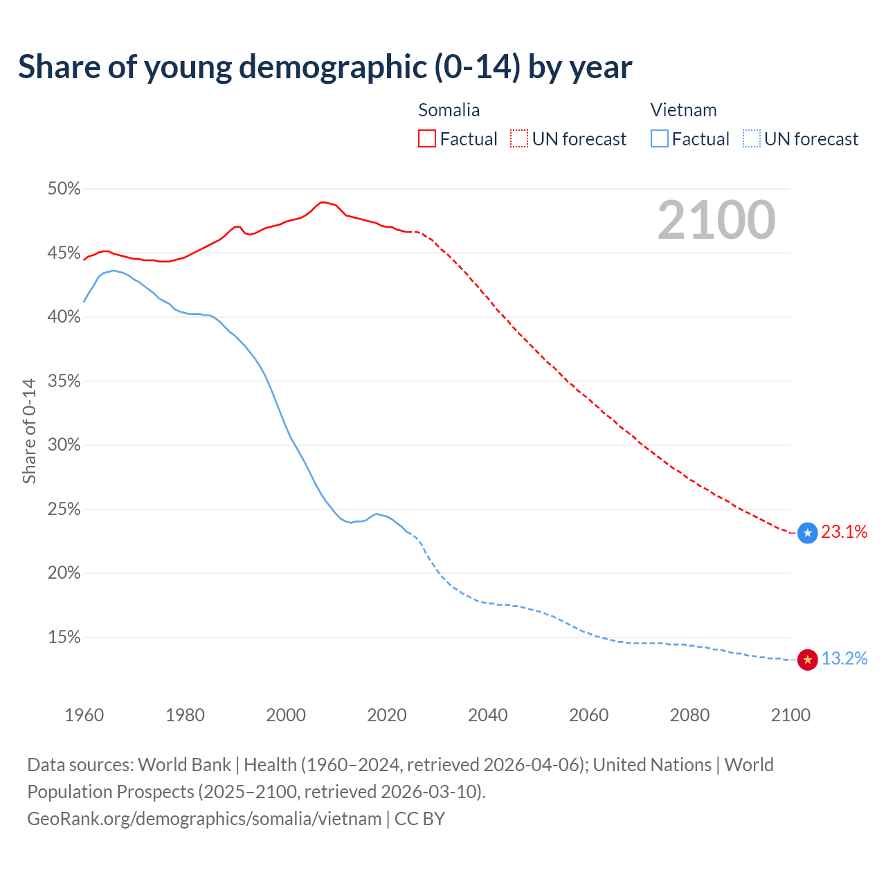 - The share of young demographic (0-15 years old) in Somalia is 46.6% vs 23.2% in Vietnam.